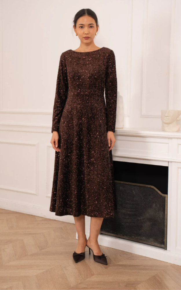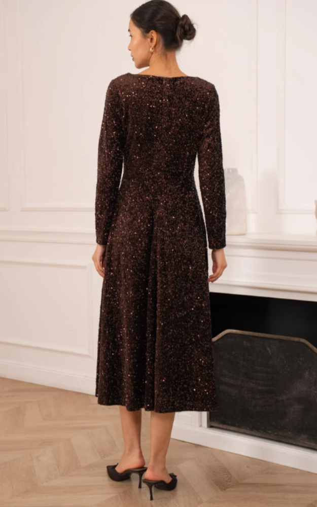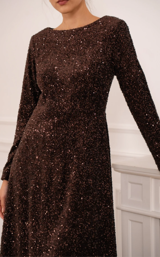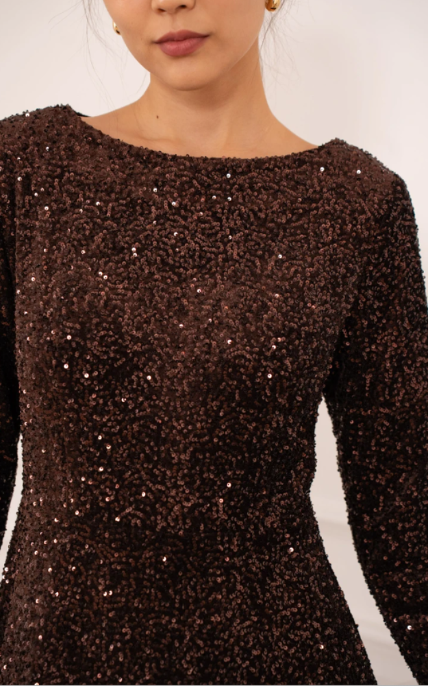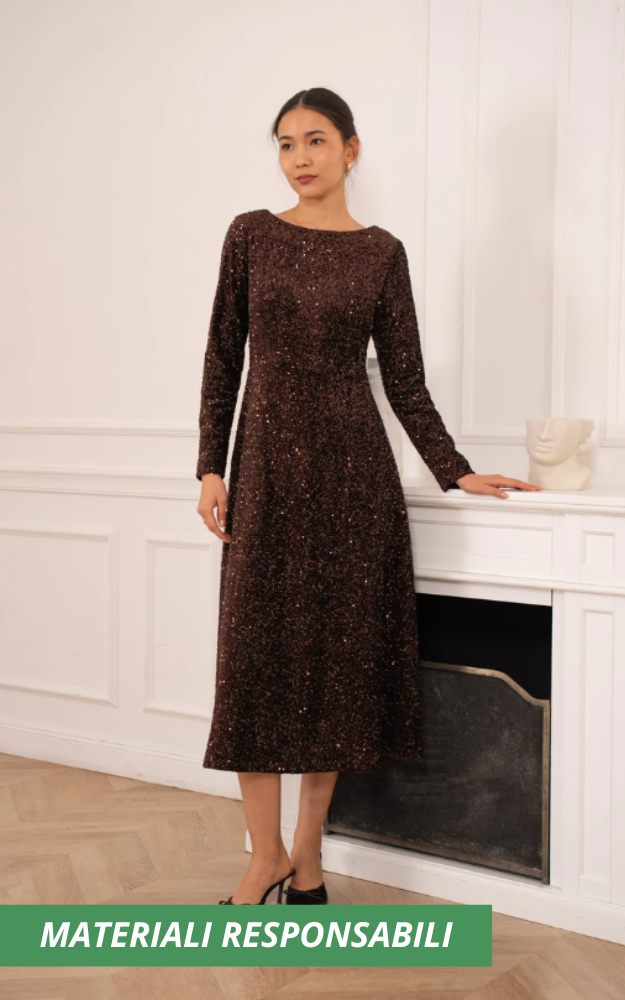 Abito lungo interamente ricoperto di paillettes brillanti, pensato per creare una silhouette raffinata e luminosa. Lo scollo a barca, semplice ed elegante, incornicia il décolleté con discrezione, mentre le maniche lunghe equilibrano il design. La gonna cade in modo fluido e leggermente svasato dalla vita, conferendo movimento e un’allure sofisticata ideale per le occasioni speciali.