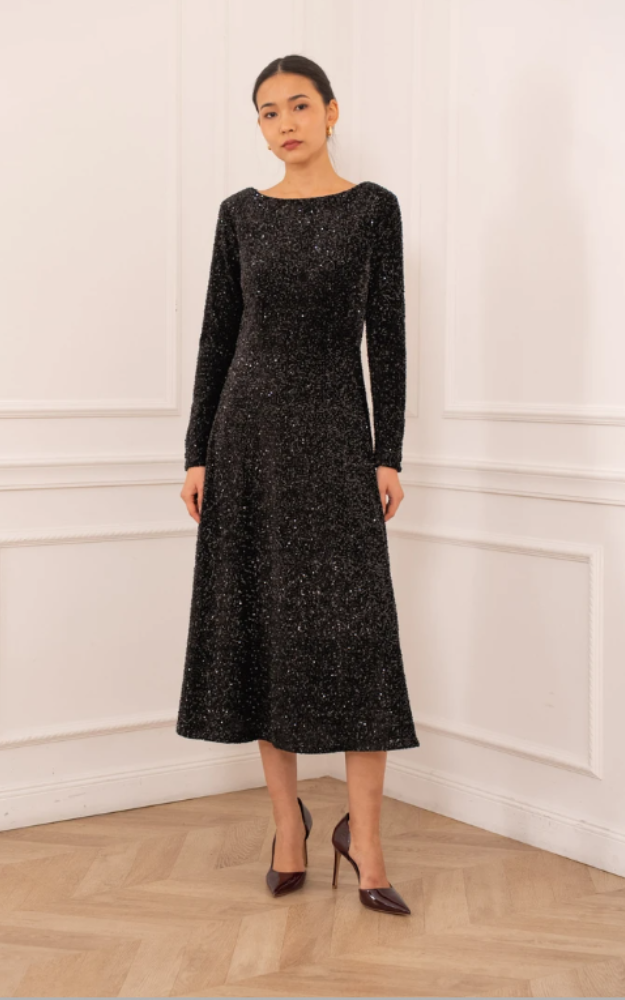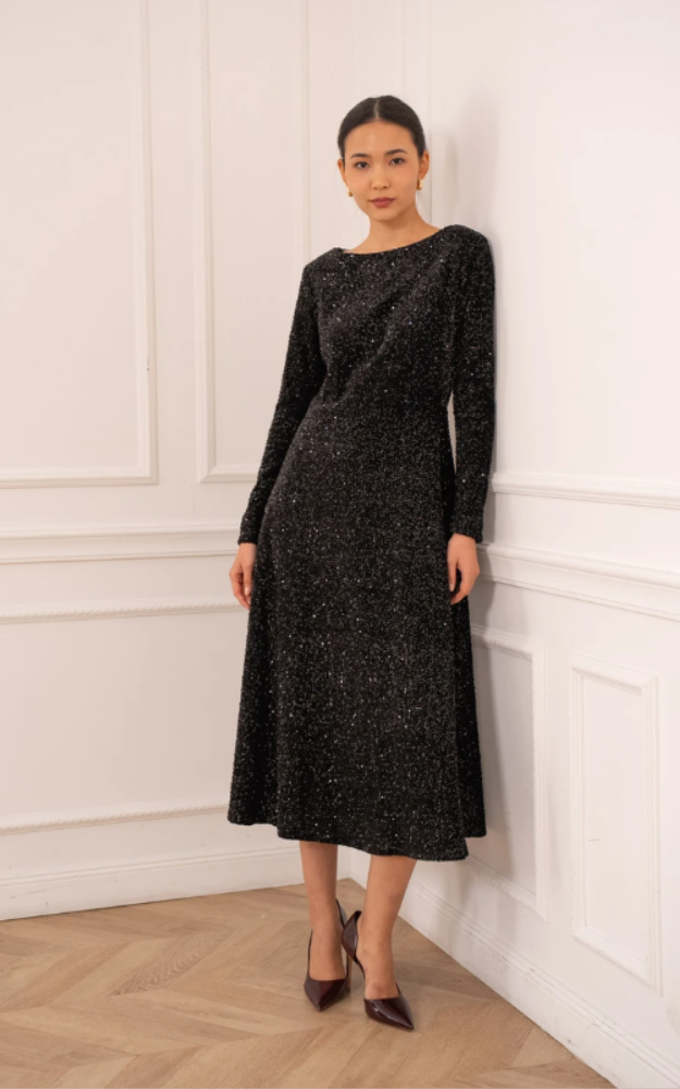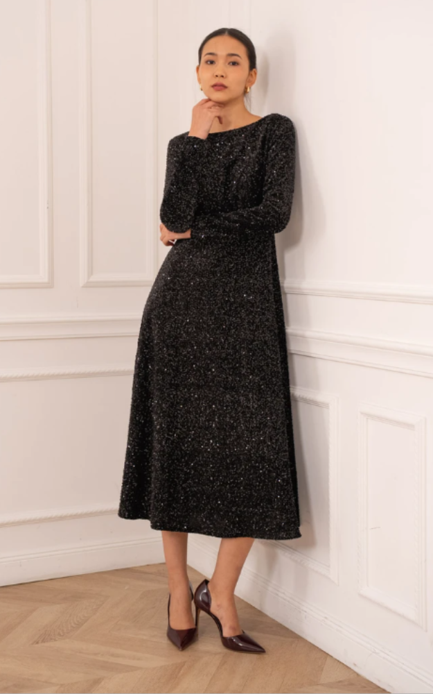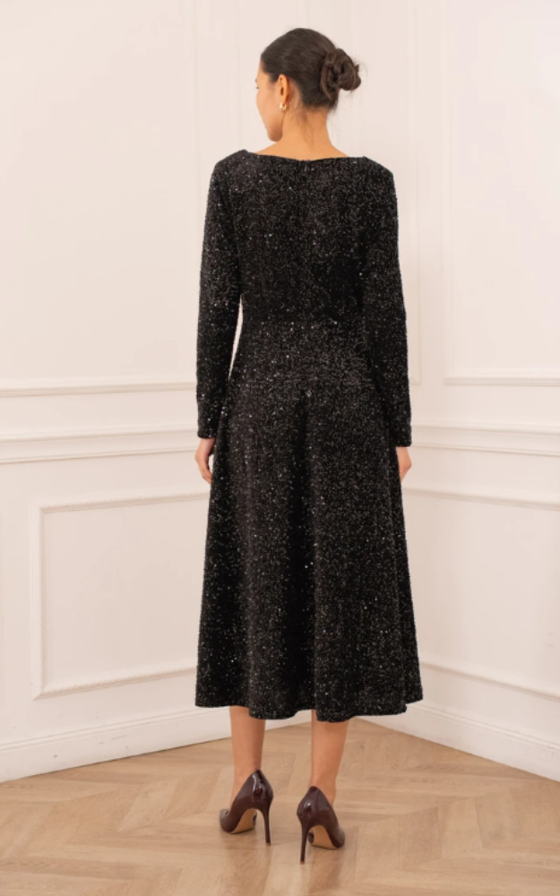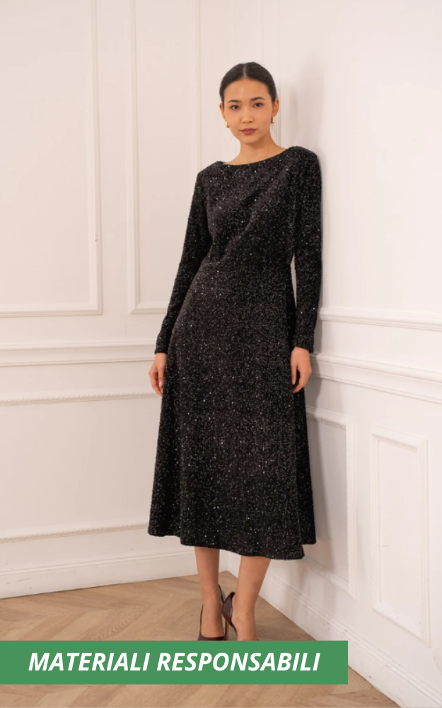 Abito lungo interamente ricoperto di paillettes brillanti, pensato per creare una silhouette raffinata e luminosa. Lo scollo a barca, semplice ed elegante, incornicia il décolleté con discrezione, mentre le maniche lunghe equilibrano il design. La gonna cade in modo fluido e leggermente svasato dalla vita, conferendo movimento e un’allure sofisticata ideale per le occasioni speciali.