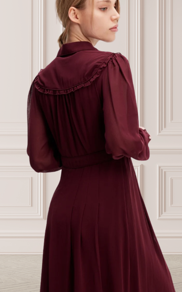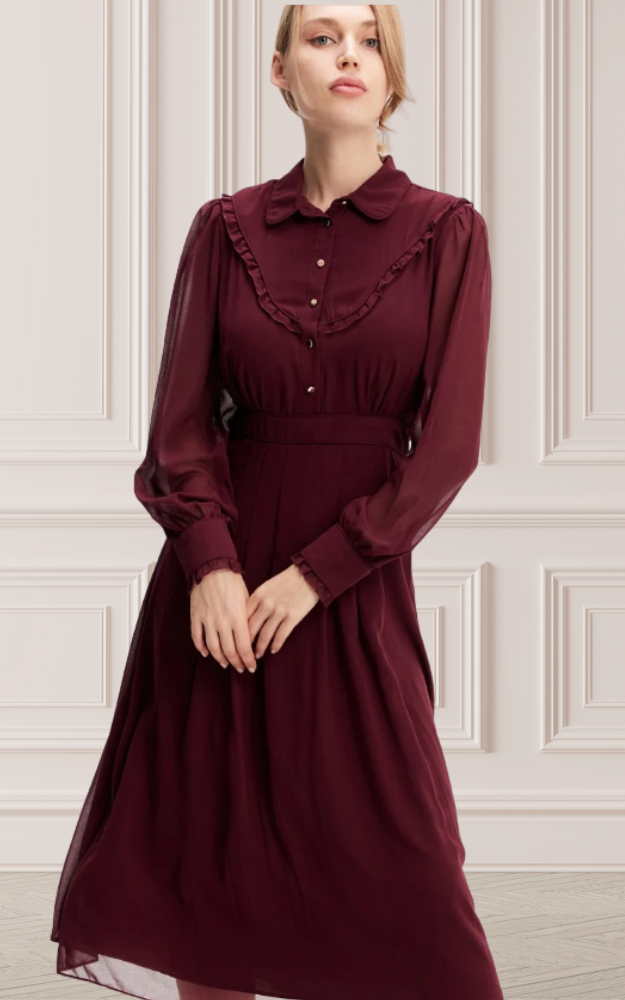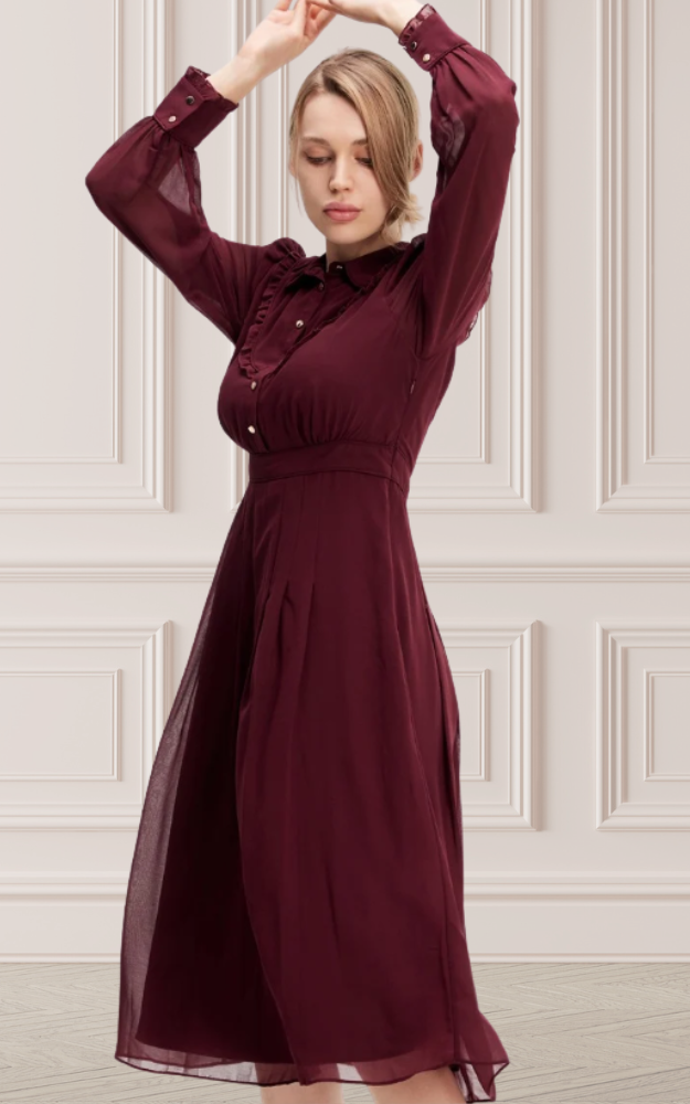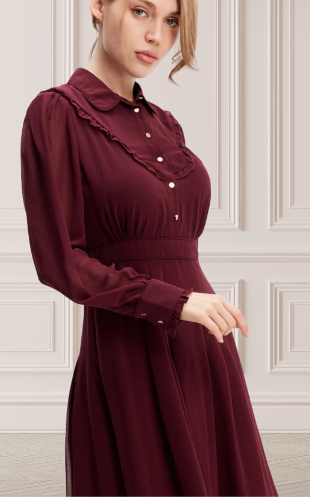 Un abito dal fascino leggermente retrò, arricchito da dettagli raffinati che lo rendono senza tempo. I bottoni dorati illuminano il davanti, mentre i piccoli volant decorano con delicatezza il corpino e i polsini. Lo sbieco sartoriale sottolinea i bordi del colletto e la linea della vita, donando armonia alla silhouette. Realizzato in voile leggero e pratico da stirare, unisce comfort ed eleganza per un capo facile da indossare in ogni occasione. La vita aderente e il volume svasato regalano movimento e femminilità, per un look elegante e versatile.