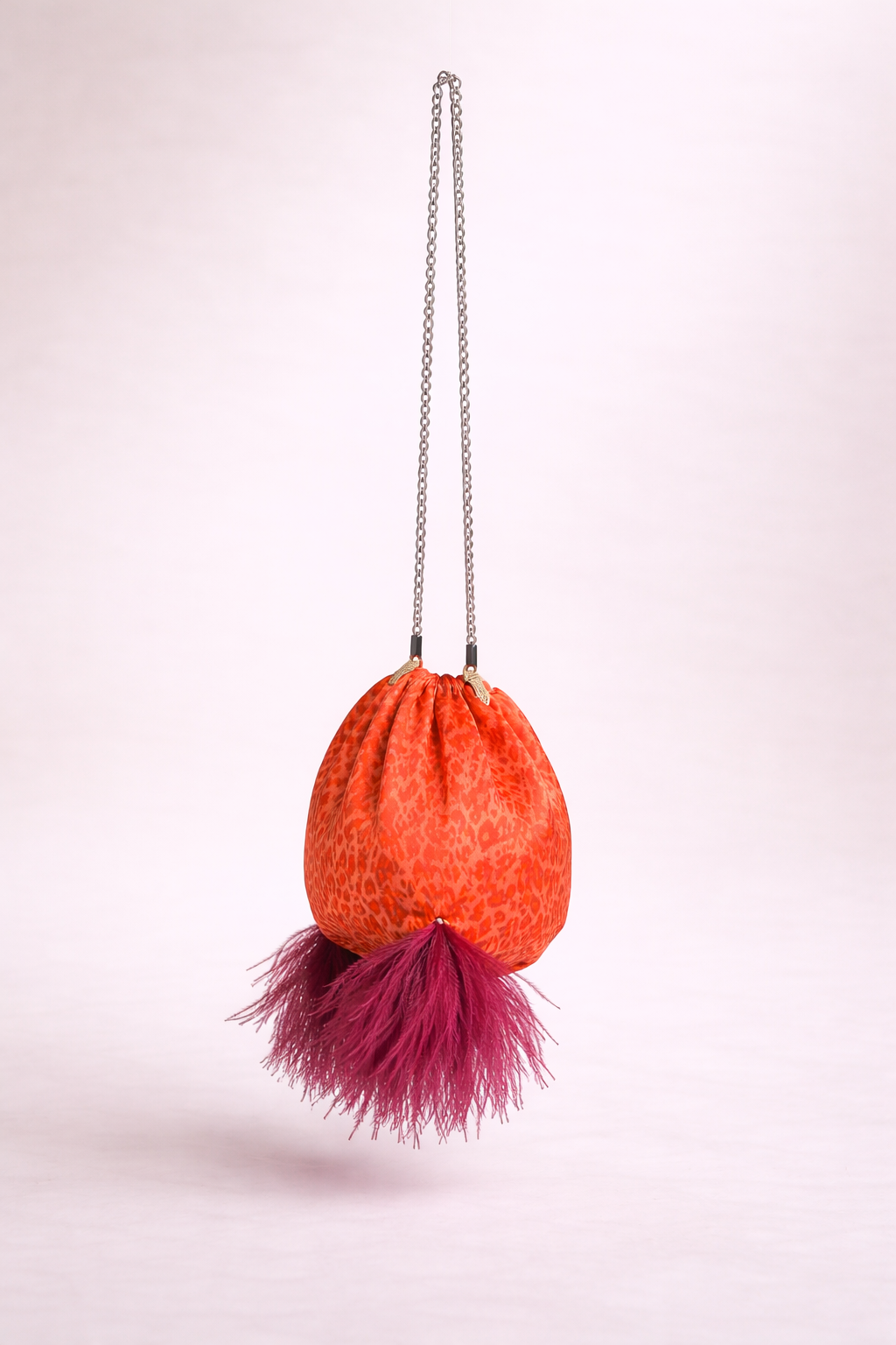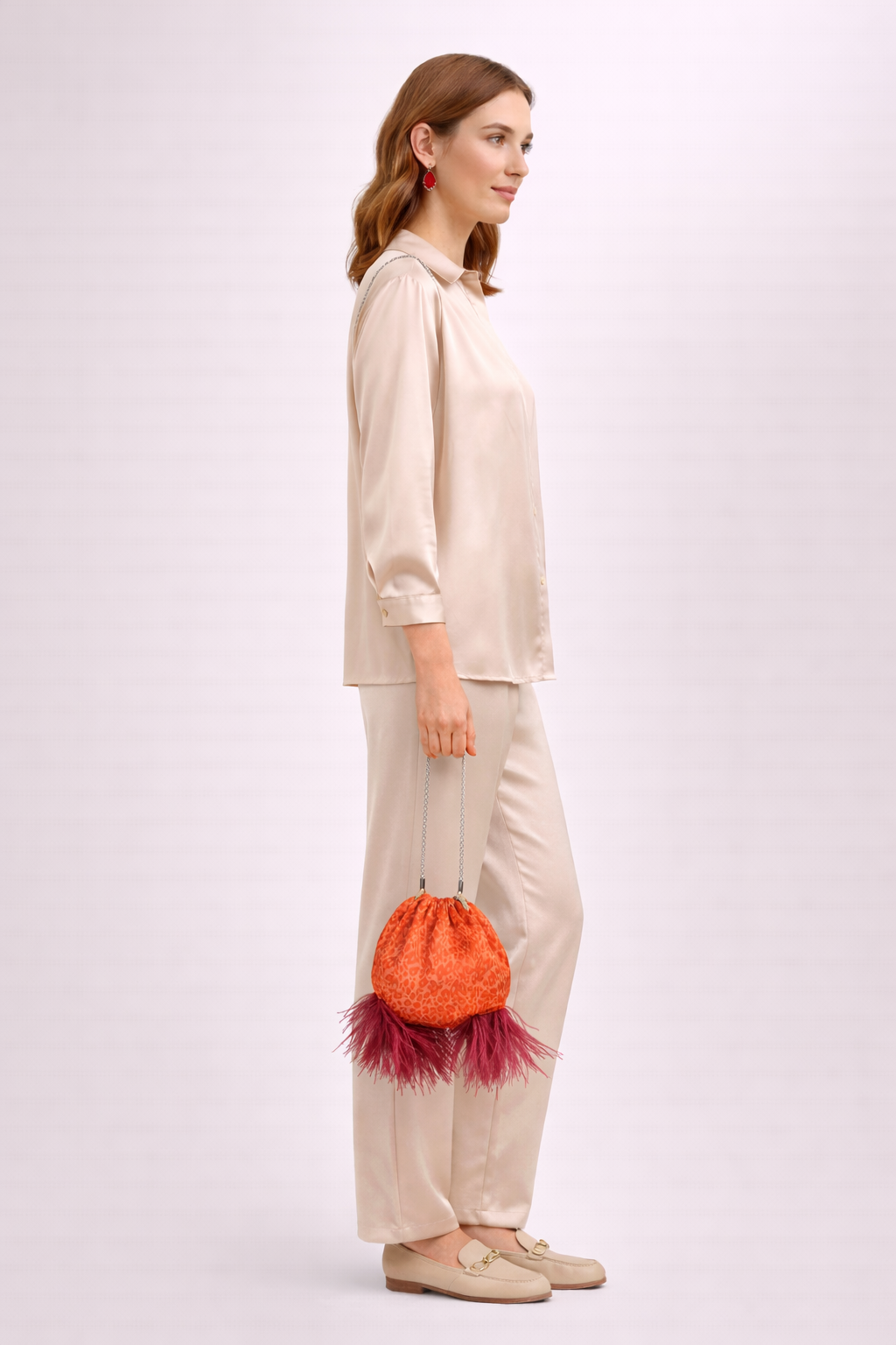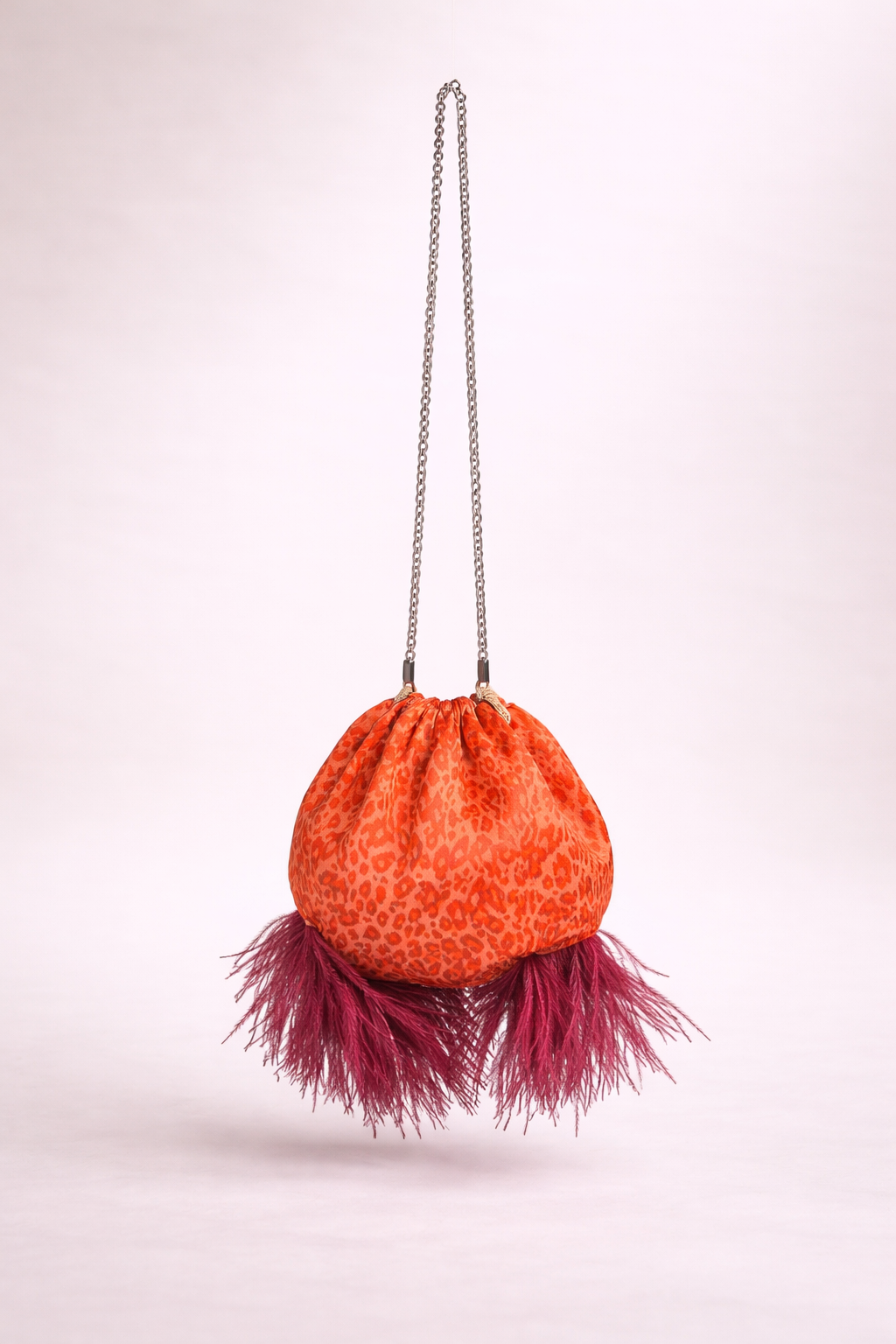 Una morbida borsa a secchiello di piccole dimensioni. Realizzata in seta con piume di struzzo che ne impreziosiscono l'eleganza. Chiusura con coulisse nella parte interna e tracolla in catena color argento.