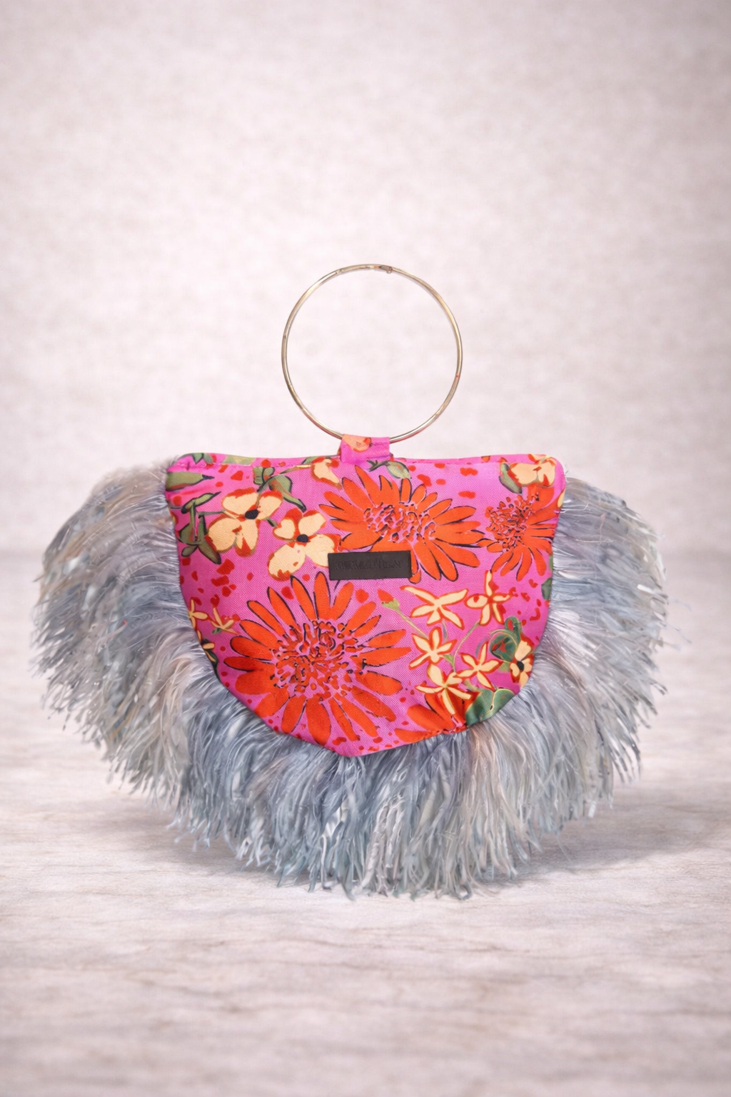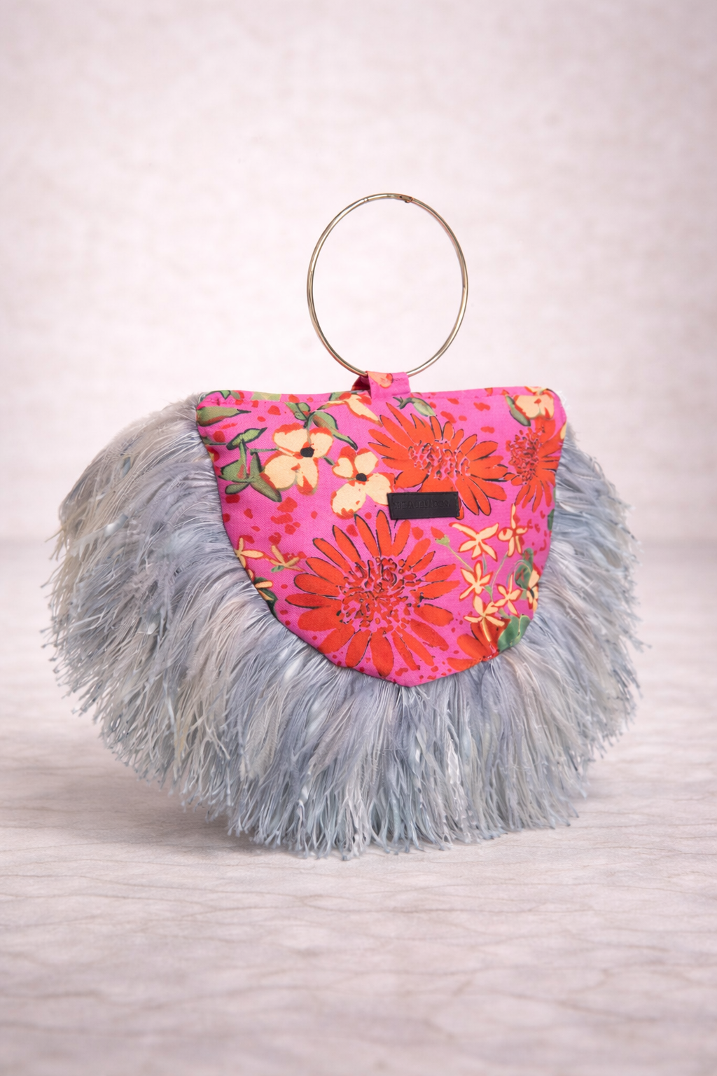 Una mezzaluna morbida con cerniera e impreziosita da un manico cerchio color argento. Il tocco speciale è dato dalle piume di struzzo che creano un contrasto accattivante sulla stampa fiorita in seta. Perfetta per contenere l'essenziale ed essere una compagna negli eventi speciali.