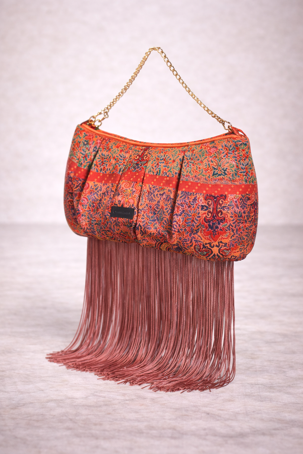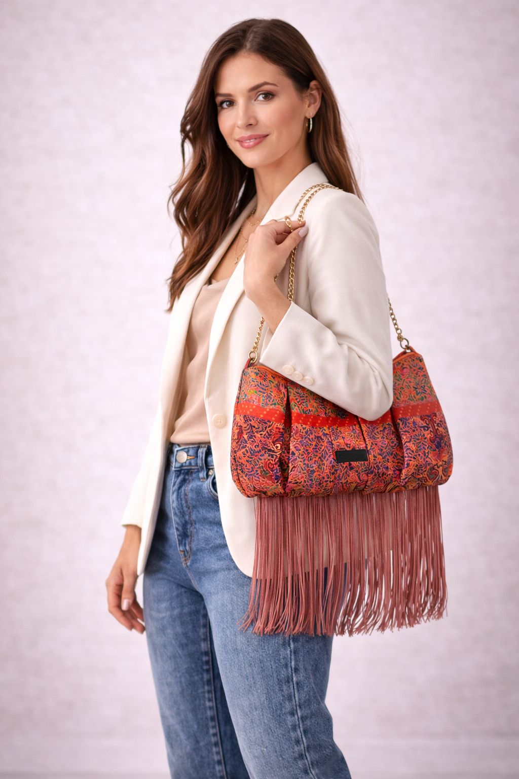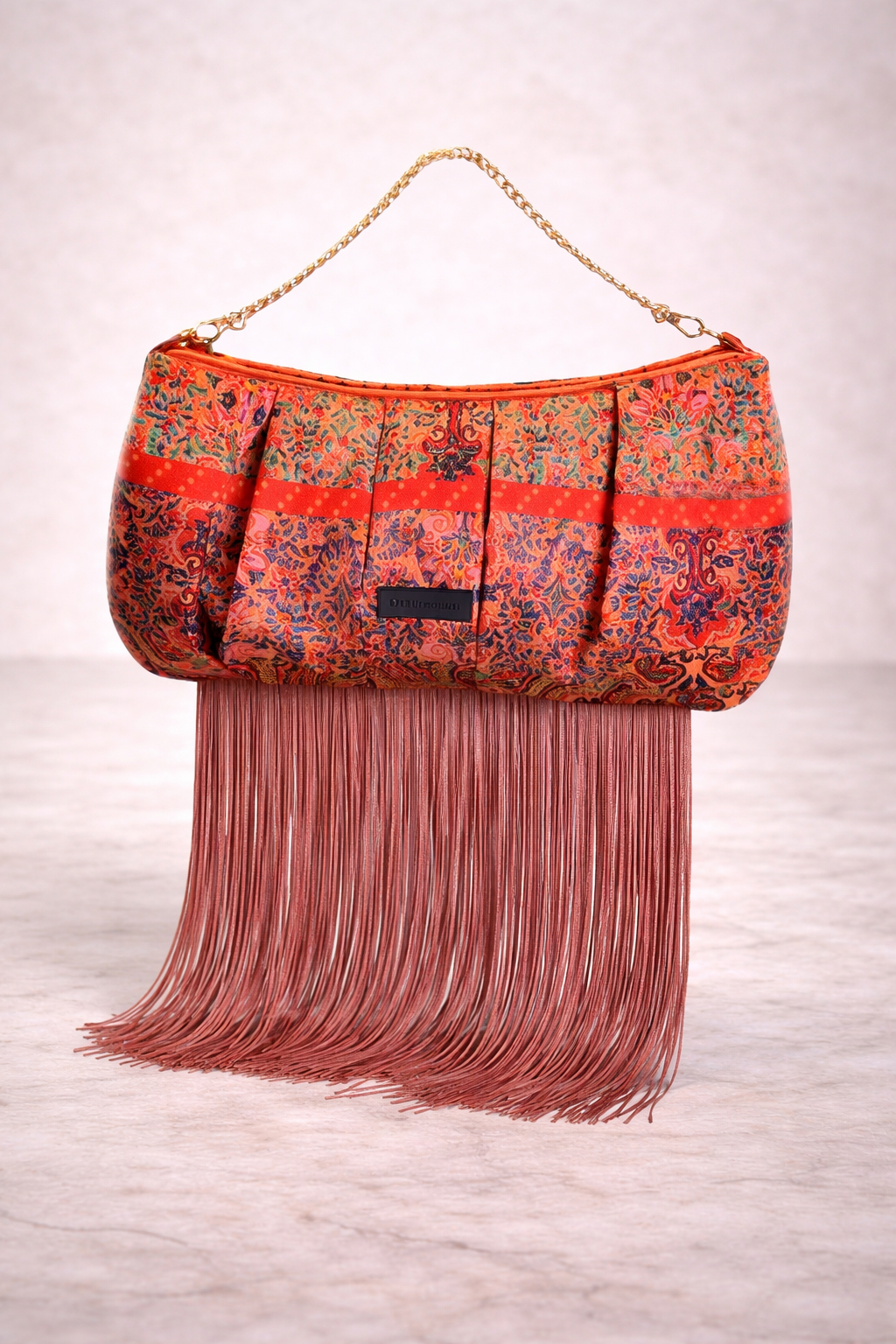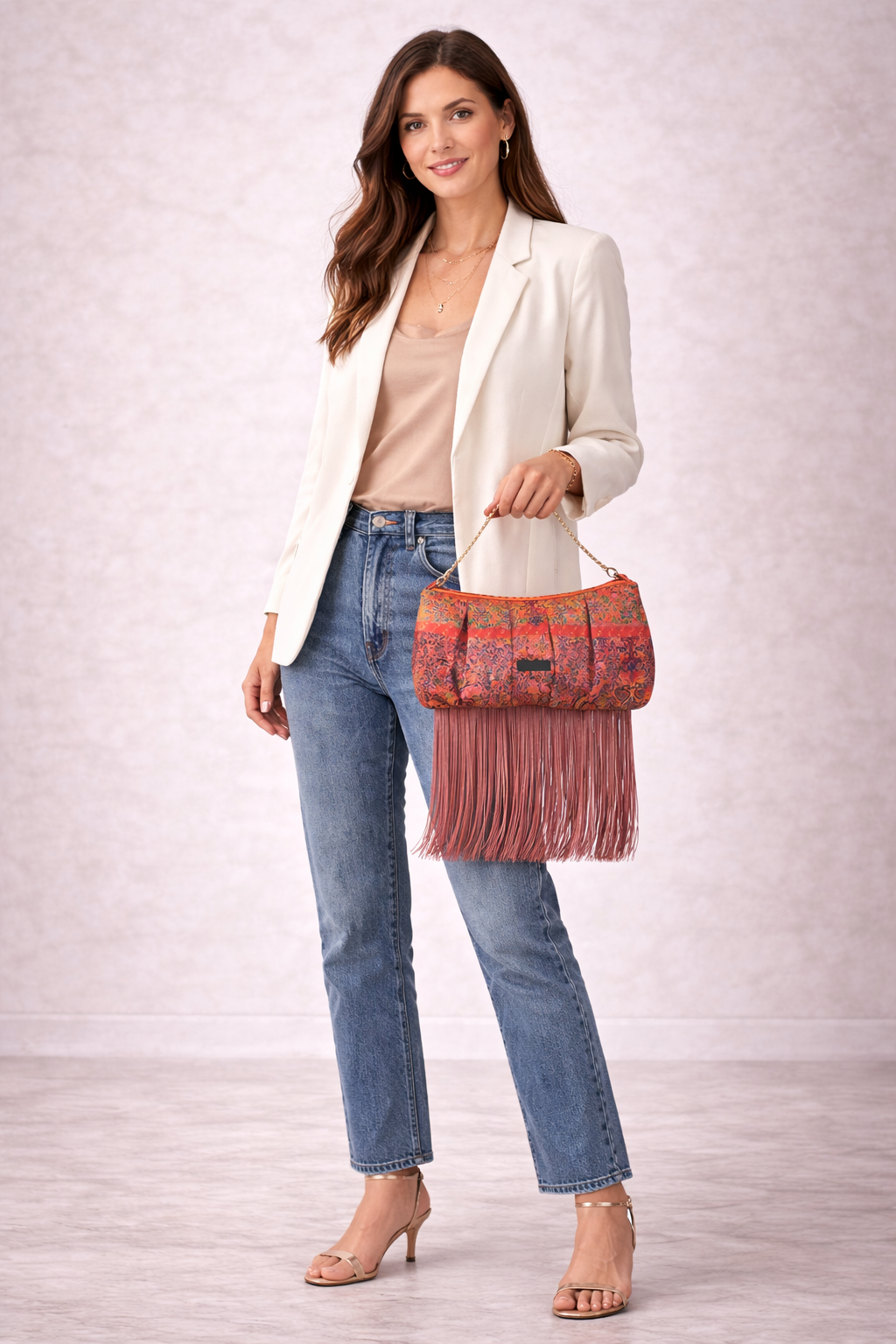 Borsa di medie dimensioni realizzata interamente in seta. Una cascata di frange e luce ne impreziosisce la silhouette stondata. Ideale per definire un look elegante o donare un tocco chic ad un outfit basic. Illuminati !