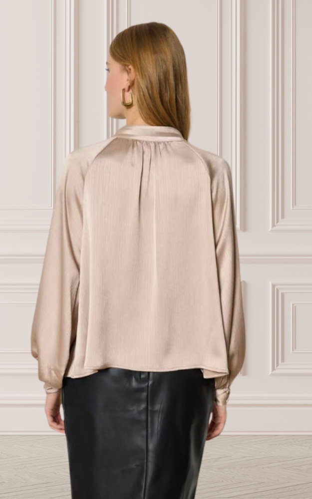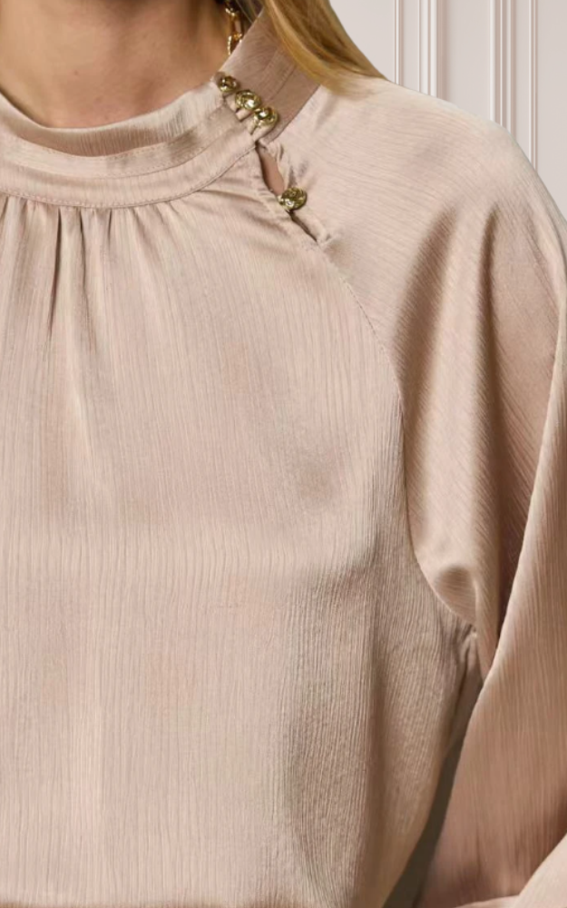 La blusa satinata Odissea esprime eleganza senza tempo con un design raffinato e dettagli luminosi. Le maniche lunghe ampie con polsini abbottonati creano un effetto morbido e sofisticato, mentre il collo alto è arricchito da bottoni dorati decorativi, che donano un tocco prezioso e distintivo.