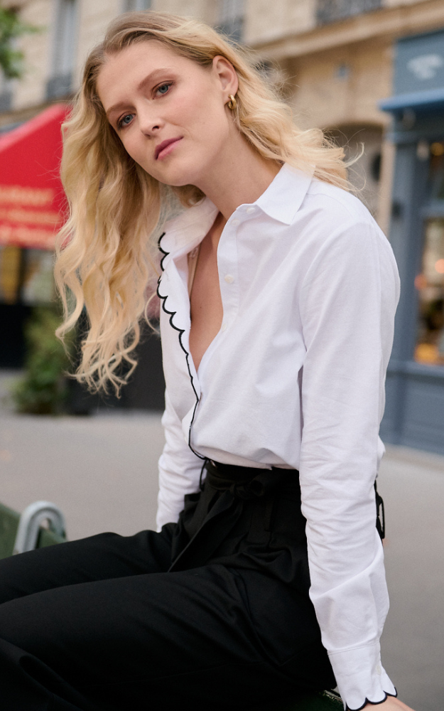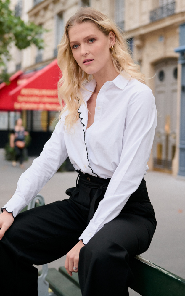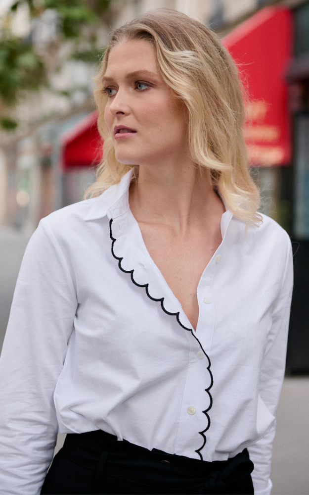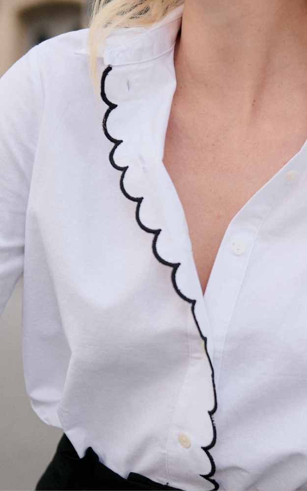 Si indossa con un gesto e accarezza la pelle con delicatezza: la camicia in cotone a maniche lunghe, taschino sul petto e bordi smerlati. Taglio dritto e bottoni in madreperla. Indossala con la gonna corta e le slingback: so pretty.