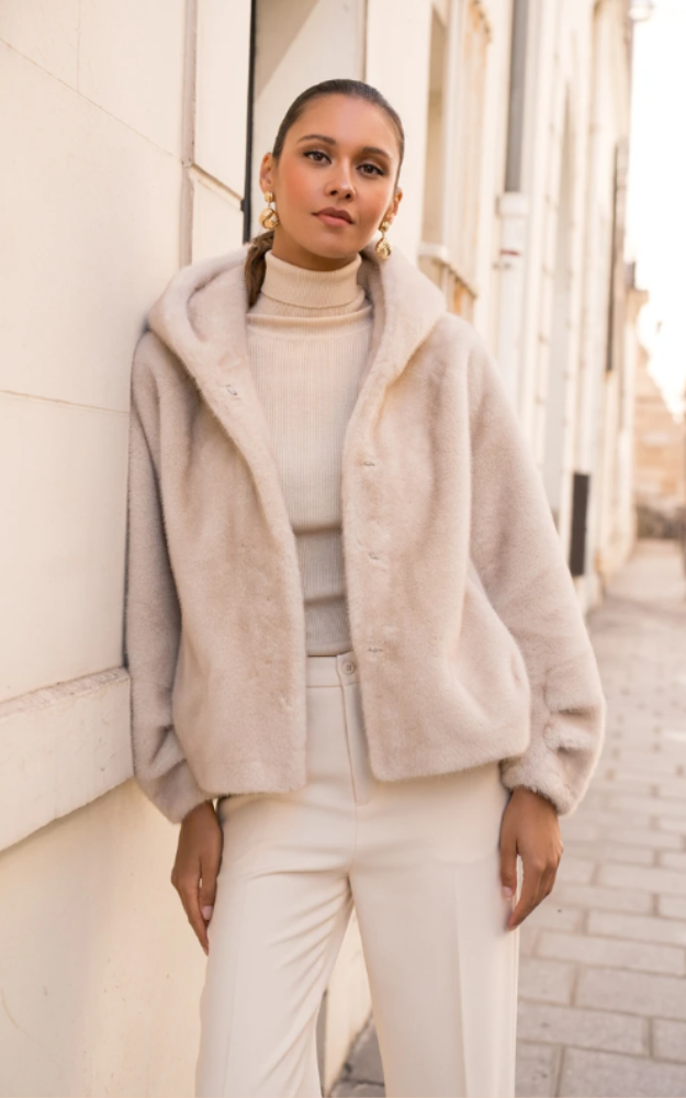 Un cappotto che unisce comfort e stile sofisticato, perfetto per avvolgerti nelle giornate fredde senza rinunciare all’eleganza. Realizzato in morbida eco-pelliccia, presenta un taglio dritto con spalle leggermente scese che dona una silhouette rilassata ma chic. Il cappuccio integrato regala un tocco accogliente, mentre la chiusura invisibile con ganci mantiene linee pulite e raffinate.