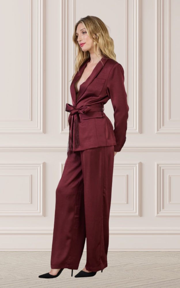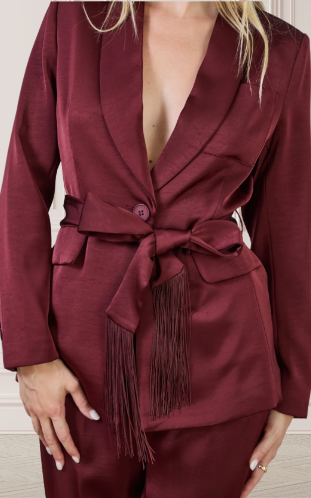 Il Blazer Amy in raso si distingue per il suo taglio dritto e raffinato, che coniuga comfort e stile senza tempo. La cintura integrata da annodare in vita valorizza la silhouette con un dettaglio femminile e sofisticato.