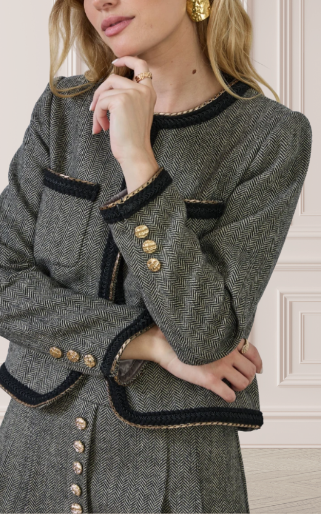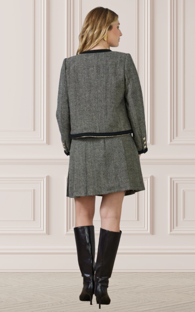 Giacca in tweed dal fascino elegante e senza tempo, impreziosita da un bordo metallico che ne esalta le linee. Le maniche lunghe e la chiusura frontale valorizzano la silhouette, mentre le due tasche applicate aggiungono un tocco funzionale e raffinato. Completamente foderata per garantire comfort e vestibilità impeccabile.