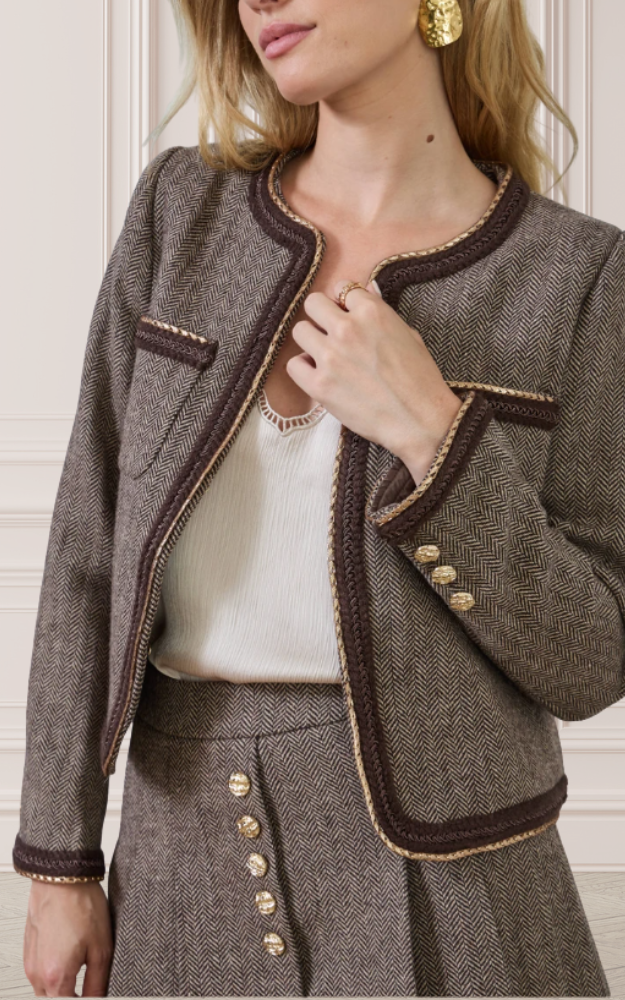 Giacca in tweed dal fascino elegante e senza tempo, impreziosita da un bordo metallico che ne esalta le linee. Le maniche lunghe e la chiusura frontale valorizzano la silhouette, mentre le due tasche applicate aggiungono un tocco funzionale e raffinato. Completamente foderata per garantire comfort e vestibilità impeccabile.