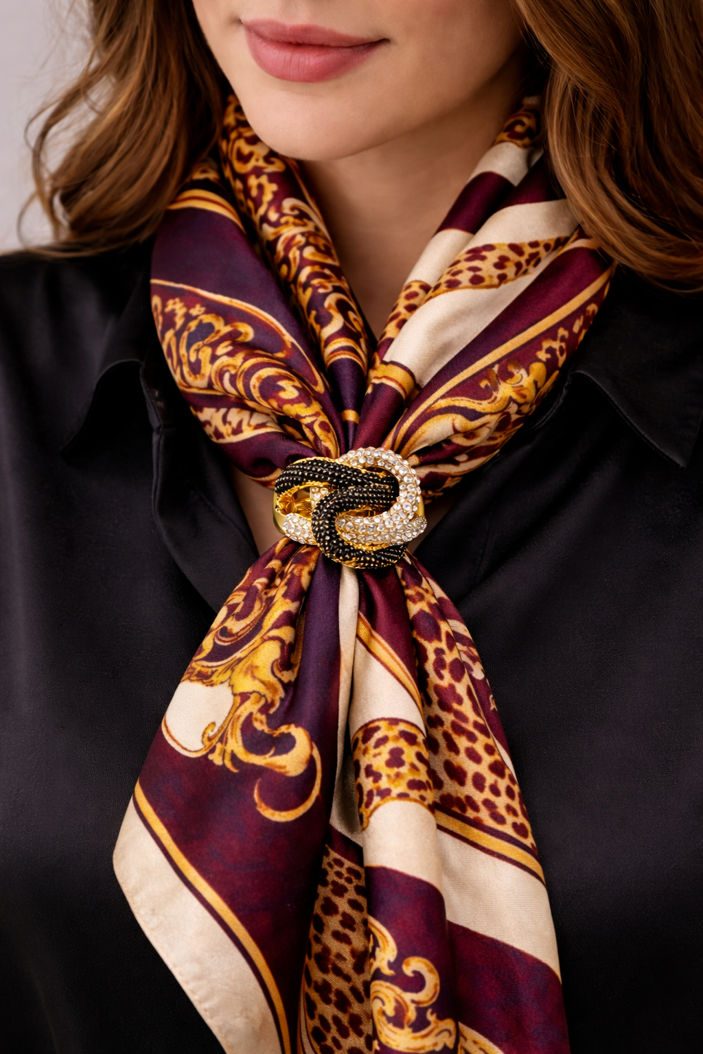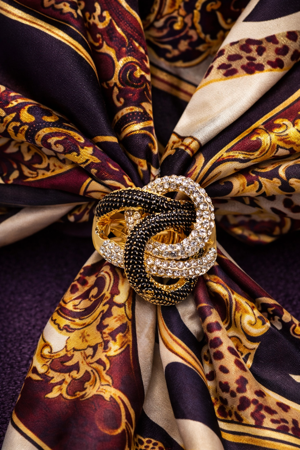 Un accessorio ricercato di cui non potrai farne a meno. Elegante e alla moda è un gioiello Ornamentum su base metallo  impreziosito da zirconi .Perfetto per impreziosire i tuoi look . Dotato di elastico interno per permettere di indossare il foulard in svariate forme. Made in Italy.