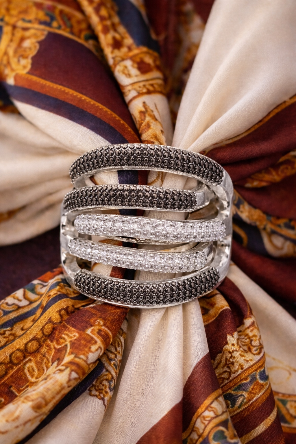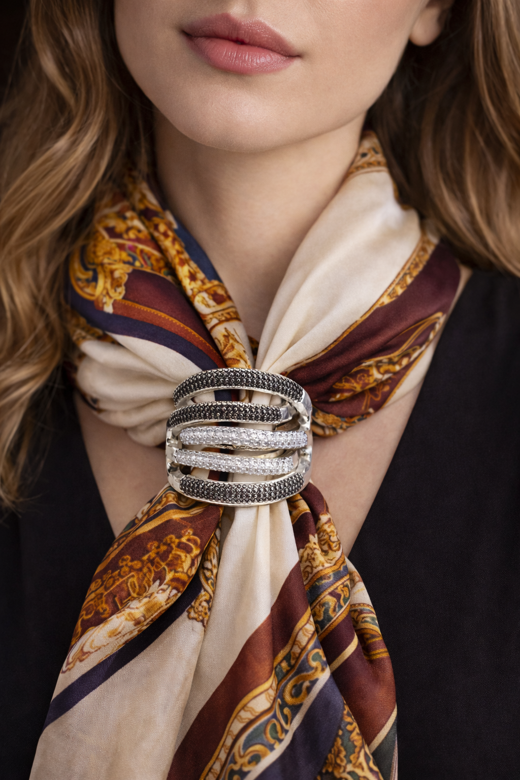 Un accessorio ricercato di cui non potrai farne a meno. Elegante e alla moda è un gioiello Ornamentum su base metallo  impreziosito da zirconi .Perfetto per impreziosire i tuoi look . Dotato di elastico interno per permettere di indossare il foulard in svariate forme. Made in Italy.