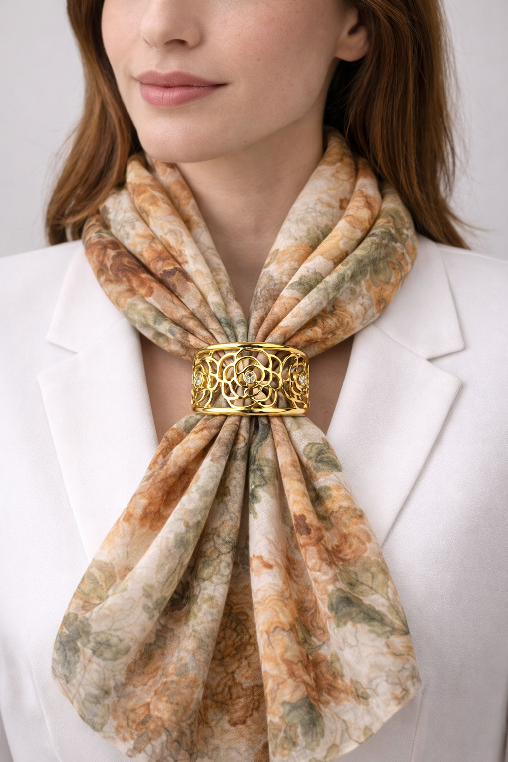 Un accessorio ricercato di cui non potrai farne a meno. Elegante e alla moda è un gioiello Ornamentum su base metallo  impreziosito da zirconi .Perfetto per impreziosire i tuoi look . Dotato di elastico interno per permettere di indossare il foulard in svariate forme. Made in Italy.