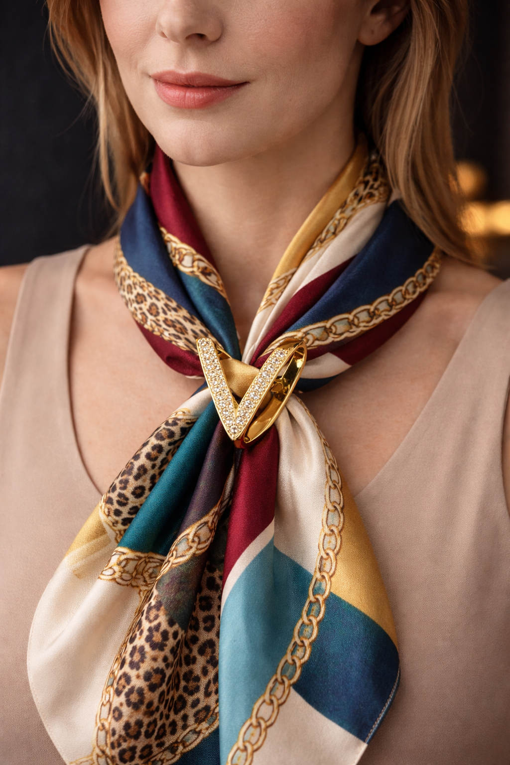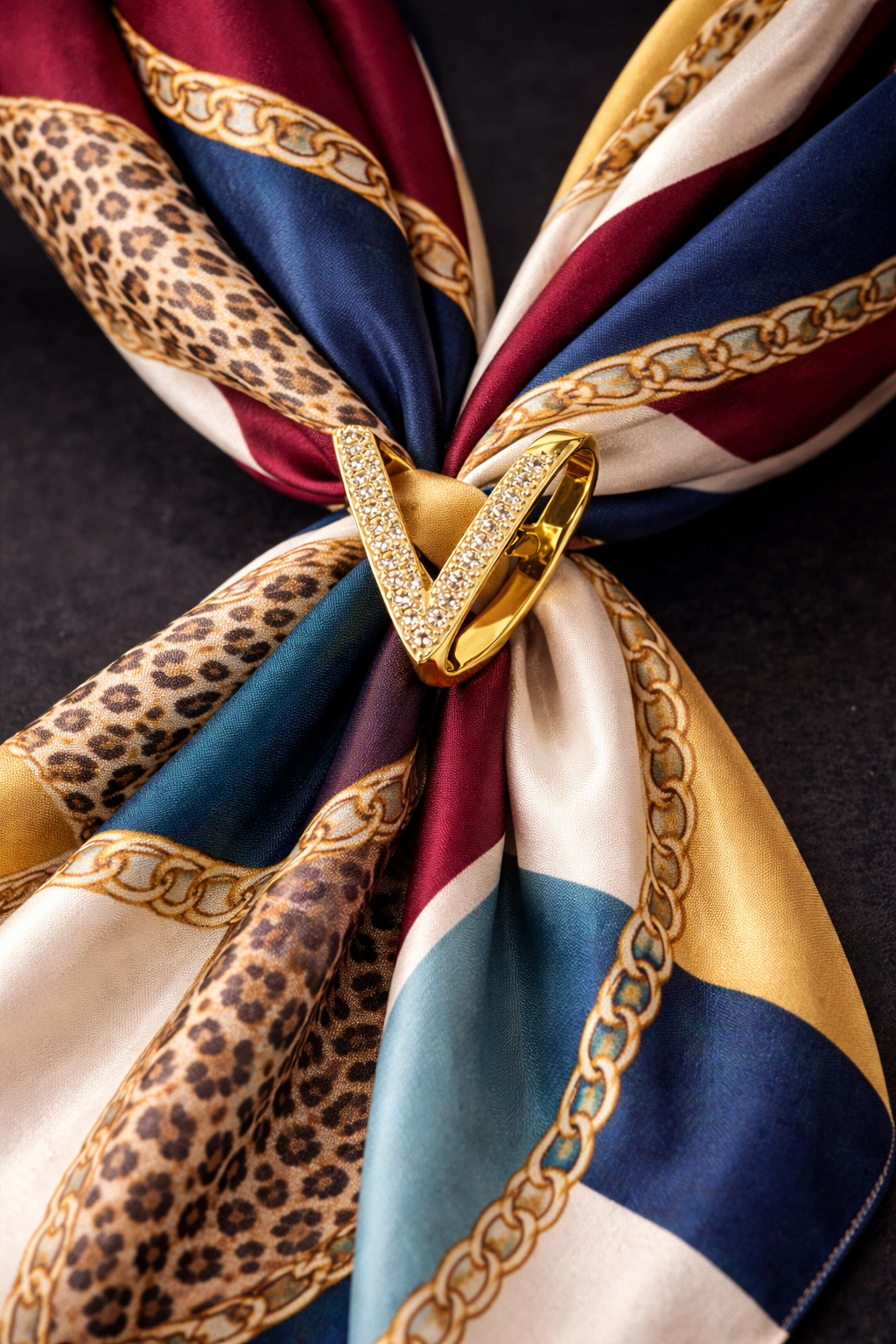 Un accessorio ricercato di cui non potrai farne a meno. Elegante e alla moda è un gioiello Ornamentum su base metallo  impreziosito da zirconi .Perfetto per impreziosire i tuoi look . Dotato di elastico interno per permettere di indossare il foulard in svariate forme.
