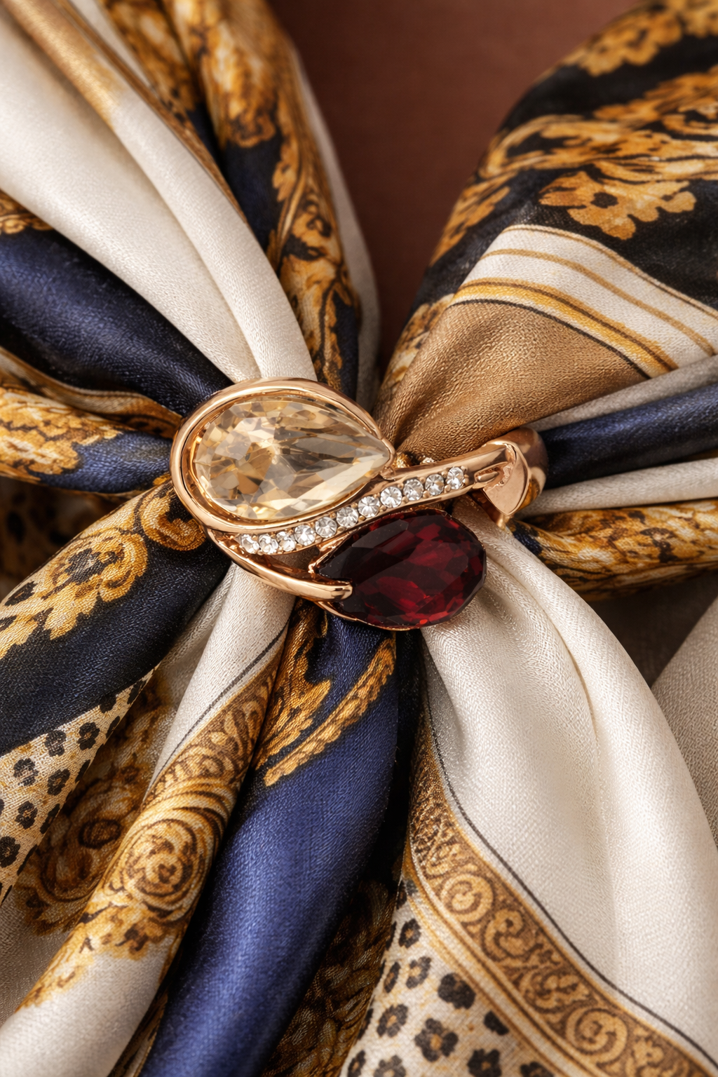 Un accessorio ricercato di cui non potrai farne a meno. Elegante e alla moda è un gioiello Ornamentum su base metallo con pietra dominante impreziosita da zirconi .Perfetto per impreziosire i tuoi look . Dotato di elastico interno per permettere di indossare il foulard in svariate forme. Made in Italy.