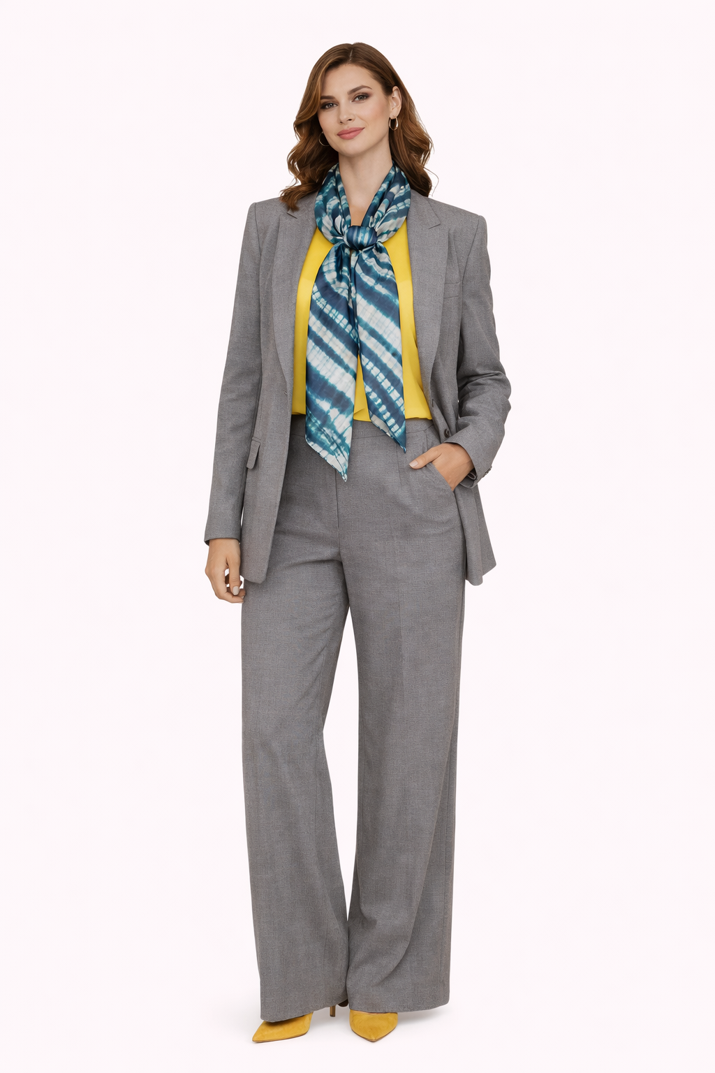 Un foulard dalle linee morbide e dai colori che rievocano il mare ed il cielo: il fascino che resiste al tempo.