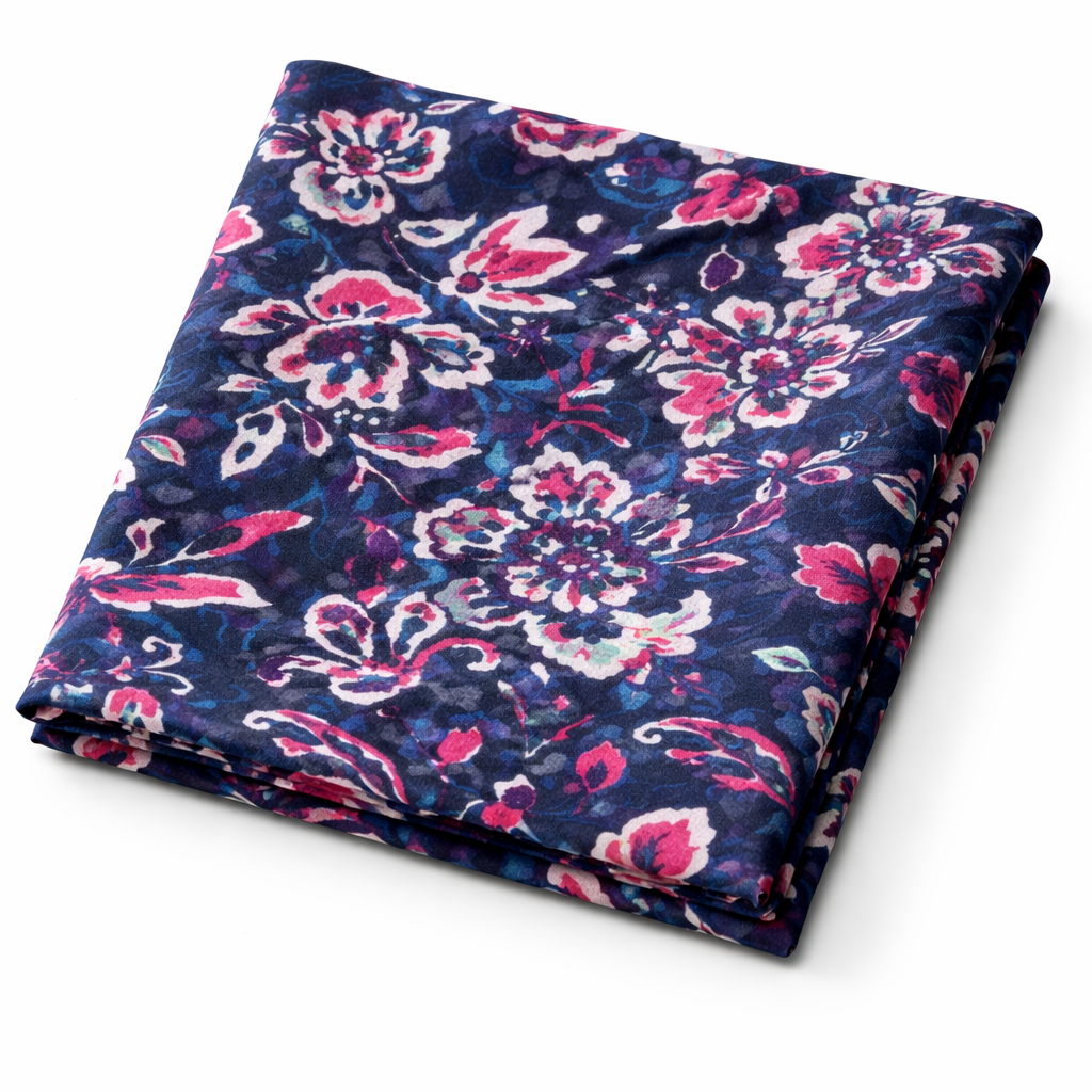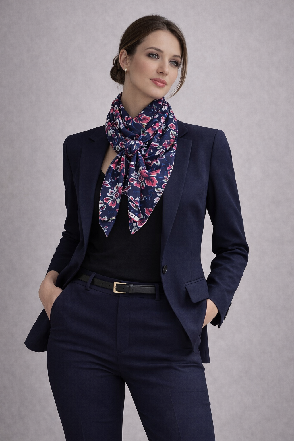 Una stampa floreale in grado di ravvivare il look con eleganza e vivacità. Un foulard, dallo sfondo blu intenso è ideale per qualsiasi stagione. Da annodare intorno al collo o alla borsa, per garantire un tocco in più all’outfit.