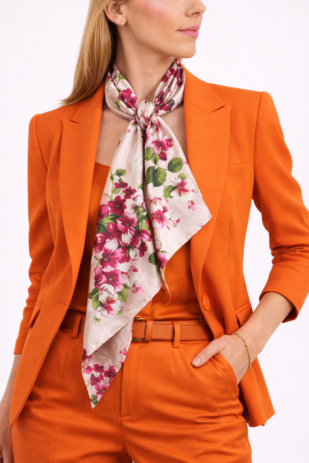 L'accessorio, dal sapore primaverile che può rifinire un look da giorno. I fiori sbocciano su tutto il foulard, immersi in un fondo in pura seta dal tono tradizionale. Abbinatelo ad un paio di décolletès rigorosamente in tono.