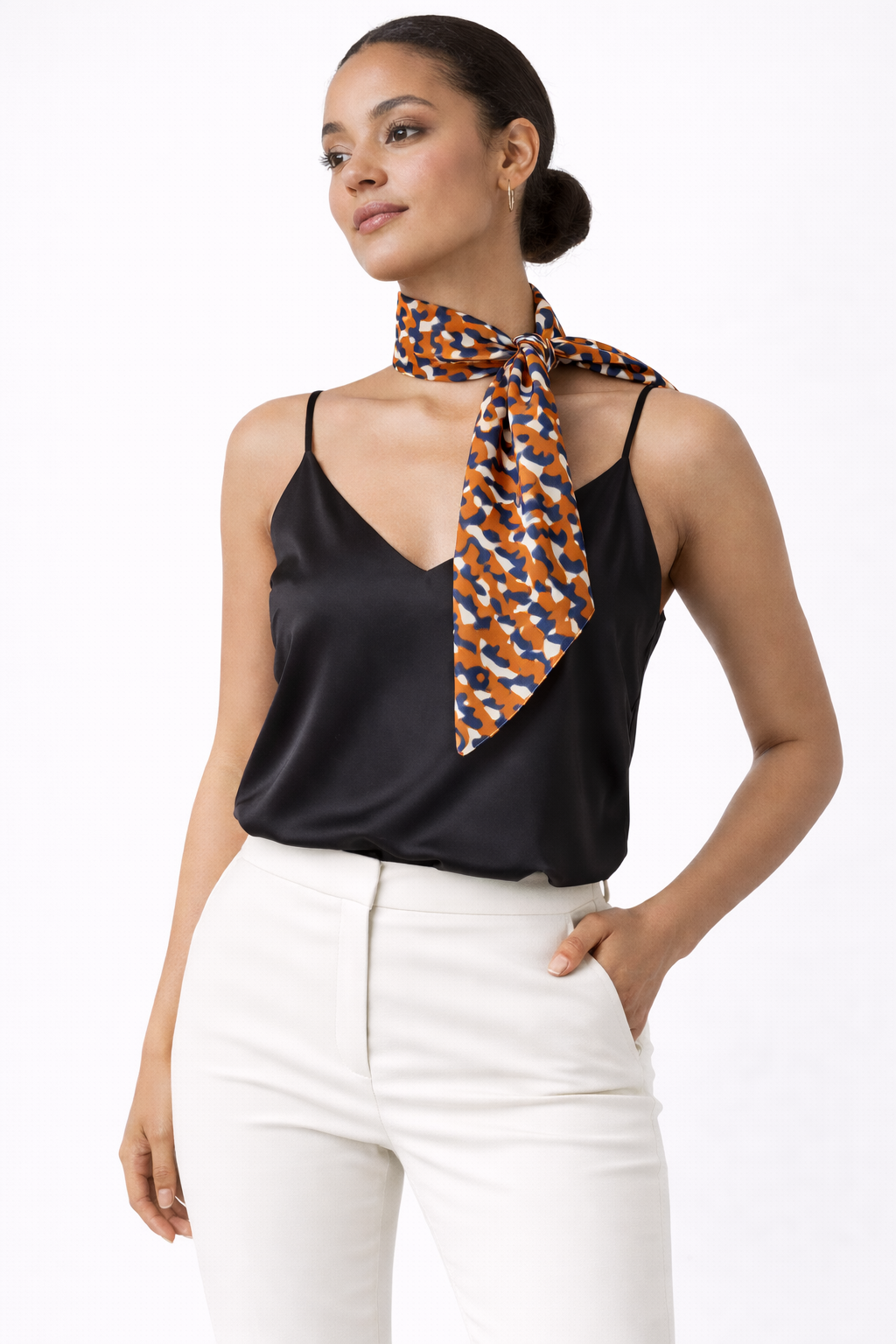 Una stampa in seta, avvolgente con i suoi colori intensi e raffinata per un’occasione particolare perché facilmente abbinabile ad un outfit sportivo o elegante. Fascino e grazia vi avvolgeranno quando indosserete questo foulard, aggiungendo un allure molto classy al vostro ensemble.