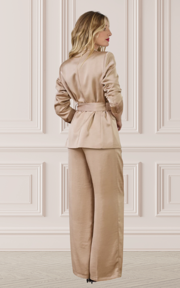 Il Blazer Amy in raso si distingue per il suo taglio dritto e raffinato, che coniuga comfort e stile senza tempo. La cintura integrata da annodare in vita valorizza la silhouette con un dettaglio femminile e sofisticato.