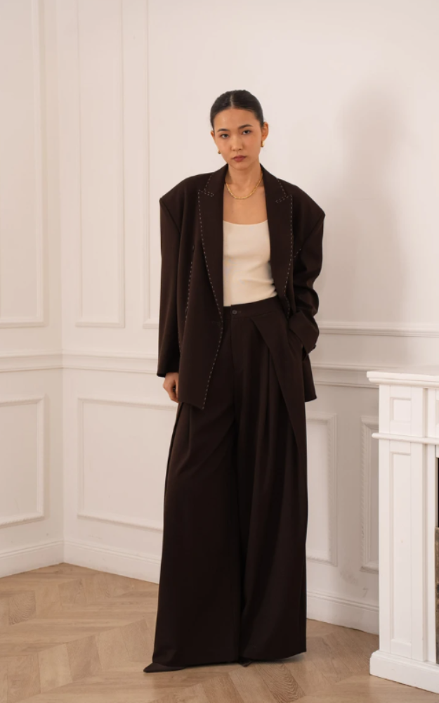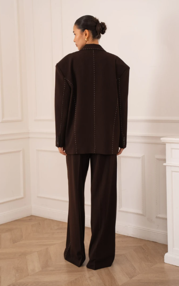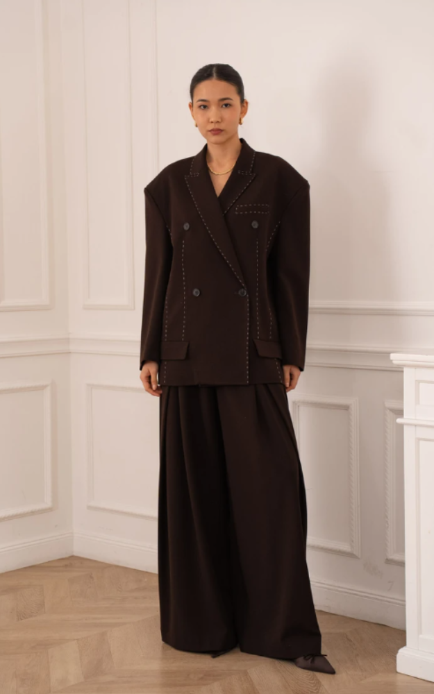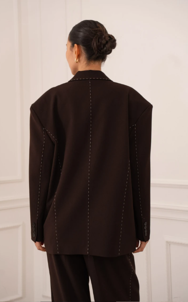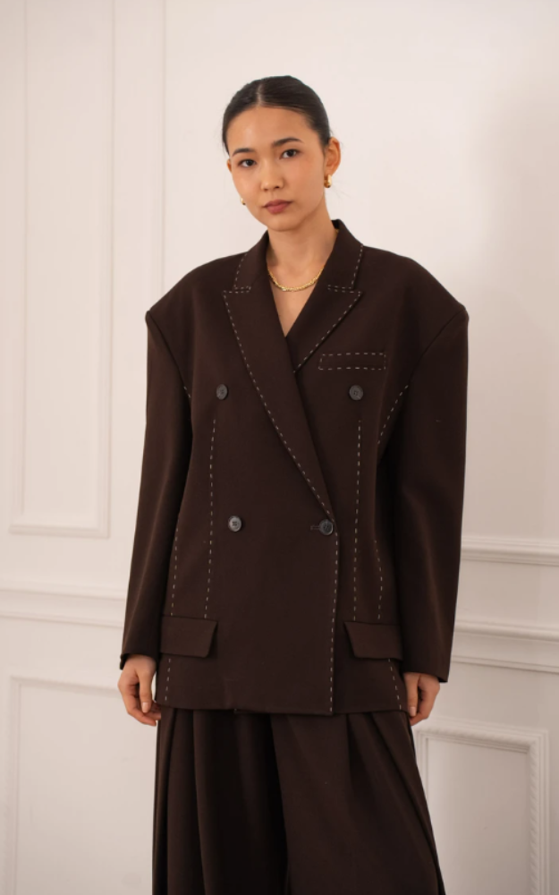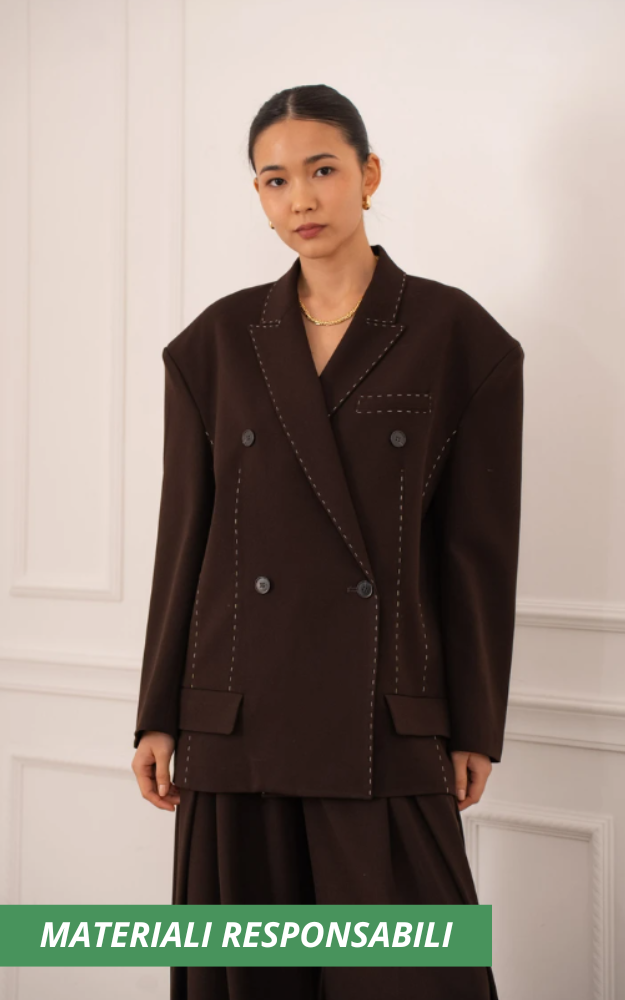 Giacca oversize doppiopetto realizzata in un tessuto strutturato, impreziosita da impunture bianche a contrasto che ne definiscono le linee con eleganza. Gli ampi revers e le tasche con patta, insieme al taschino profilato sul petto, donano un tocco sartoriale e contemporaneo. Un capo dal carattere deciso, ideale per creare look moderni e raffinati.