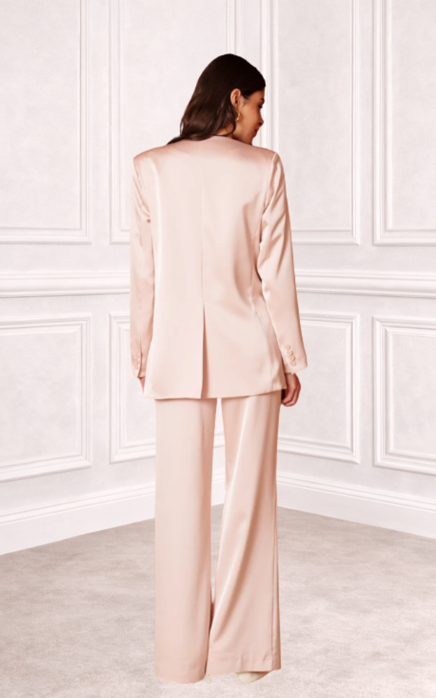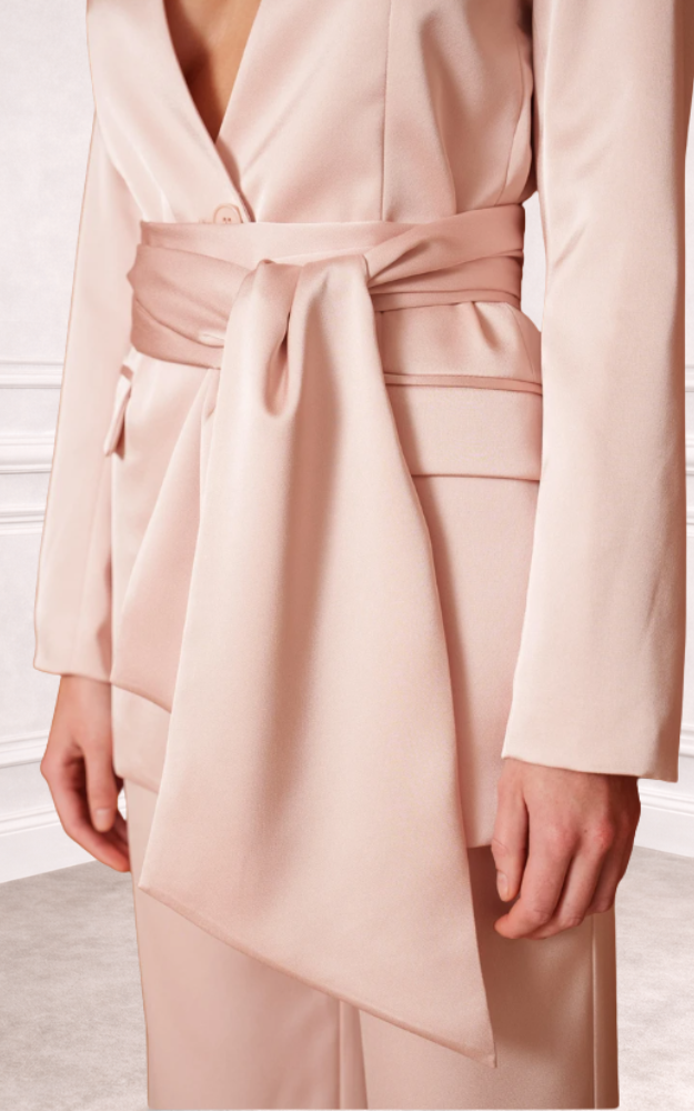 Una giacca dal fascino sofisticato e luminoso, realizzata in un elegante tessuto satinato che cattura la luce con naturalezza. Il taglio fluido e lo scollo profondo valorizzano la silhouette, mentre la cintura da annodare definisce il punto vita con un tocco femminile e contemporaneo. Versatile e raffinata, la cintura può essere indossata anche come sciarpa, aggiungendo un dettaglio distintivo. Le tasche con patta e il taschino sul petto completano il design con richiami sartoriali. Perfetta per occasioni speciali, cerimonie o look serali di grande impatto.