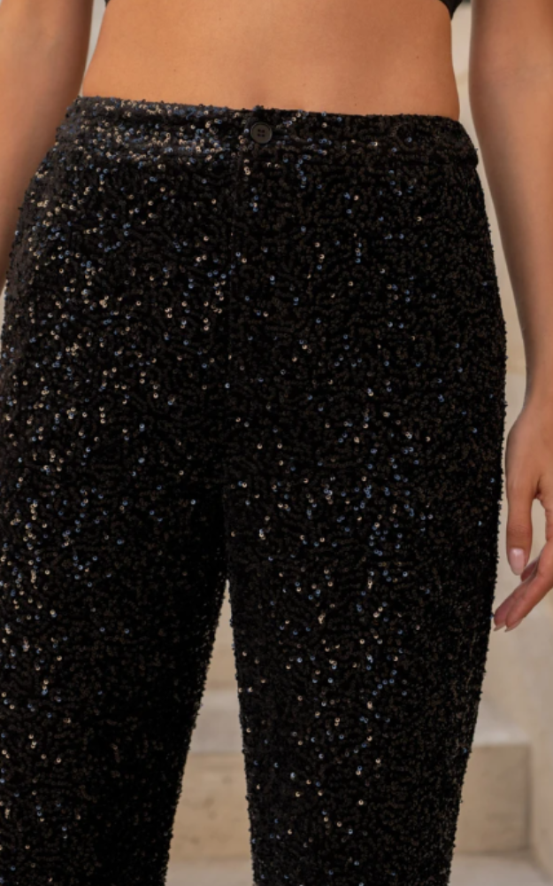 La chiusura con bottone e zip nascosta mantiene la linea pulita e sofisticata, mettendo in risalto l’effetto luminoso delle paillettes che ricoprono interamente il tessuto.