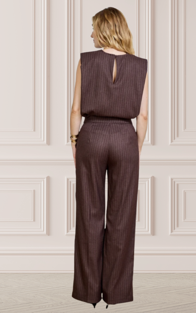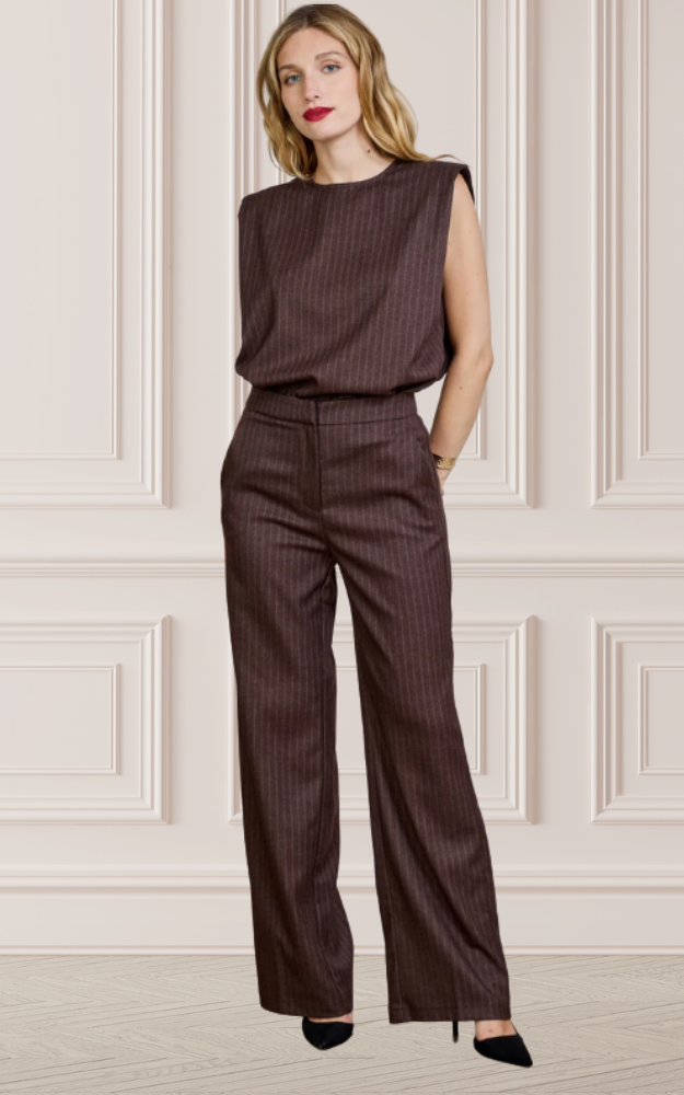 Pantaloni sartoriali in tessuto effetto flanella a righe dal fascino senza tempo. Il taglio dritto e fluido slancia la figura con eleganza, mentre le tasche laterali anteriori e la chiusura con zip frontale garantiscono praticità e comfort. Un modello raffinato, perfetto da abbinare alla giacca Thomas e ai top coordinati per un completo impeccabile, oppure da indossare singolarmente per look più versatili.