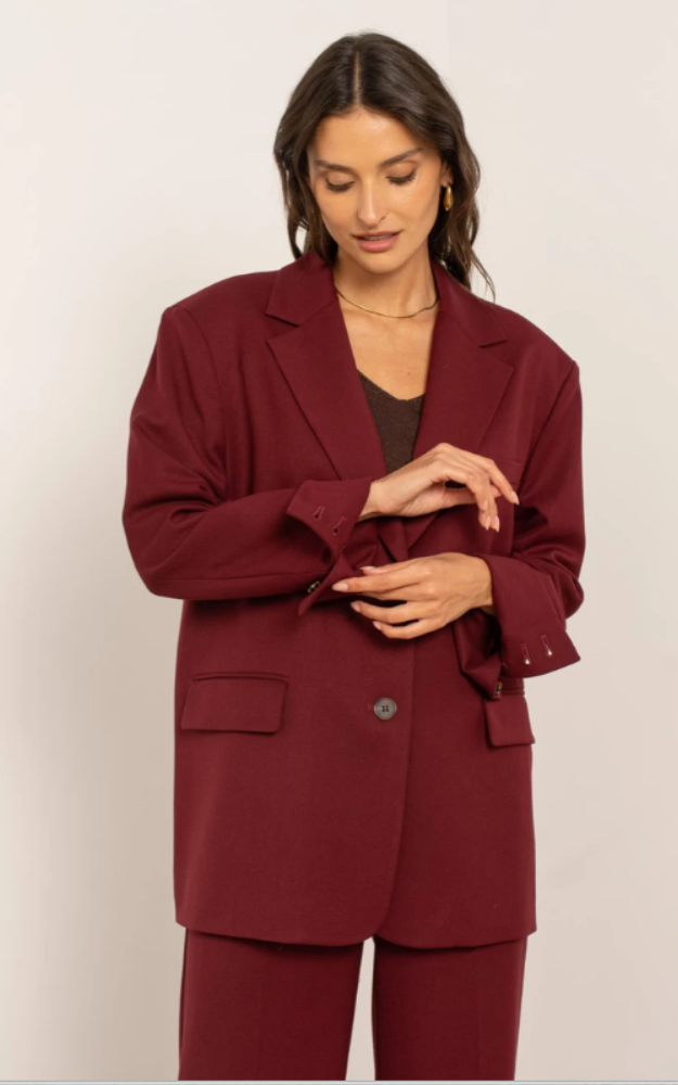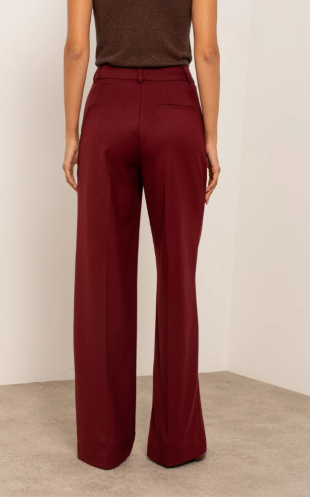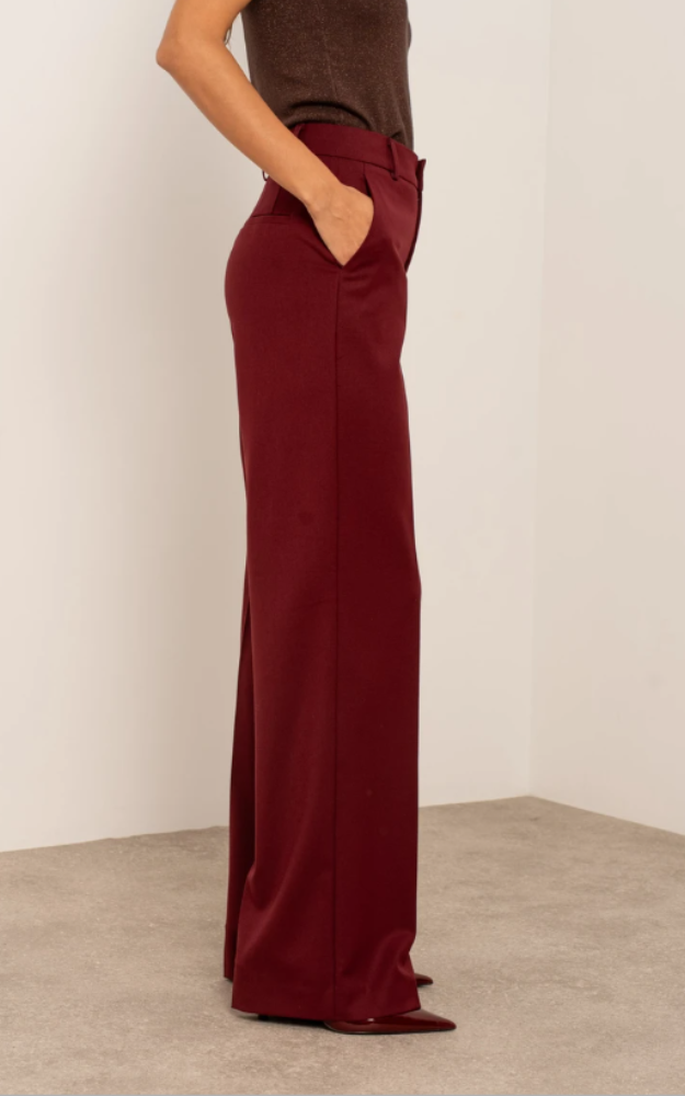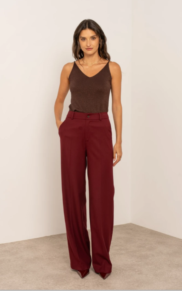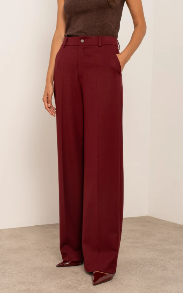 Pantaloni sartoriali a gamba larga, caratterizzati da una linea fluida e senza tempo. La vita alta, le pieghe marcate e la chiusura classica donano una silhouette elegante e slanciata. Completano il modello le tasche italiane frontali e le tasche a filetto sul retro. Un capo versatile e raffinato, perfetto per un look chic quotidiano.