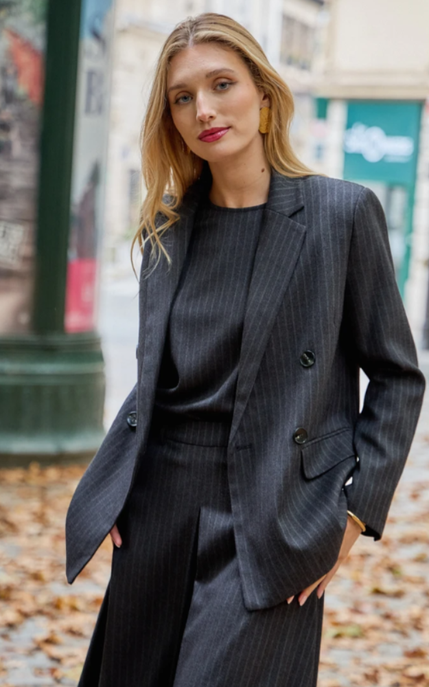 Top strutturato a righe sottili, dal taglio pulito e moderno. Le linee essenziali e le mini spalline creano un effetto scultoreo che dona carattere al look, mantenendo al tempo stesso un’eleganza minimal. Perfetto in coordinato con i pantaloni, la giacca o la gonna Thomas, ma anche come pezzo singolo per outfit versatili e sofisticati.