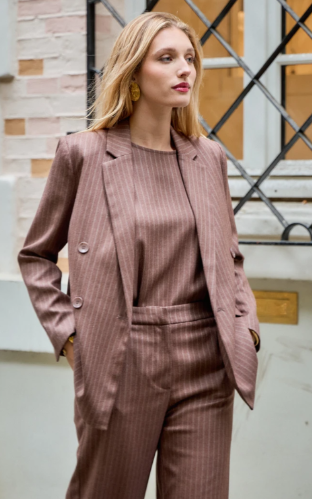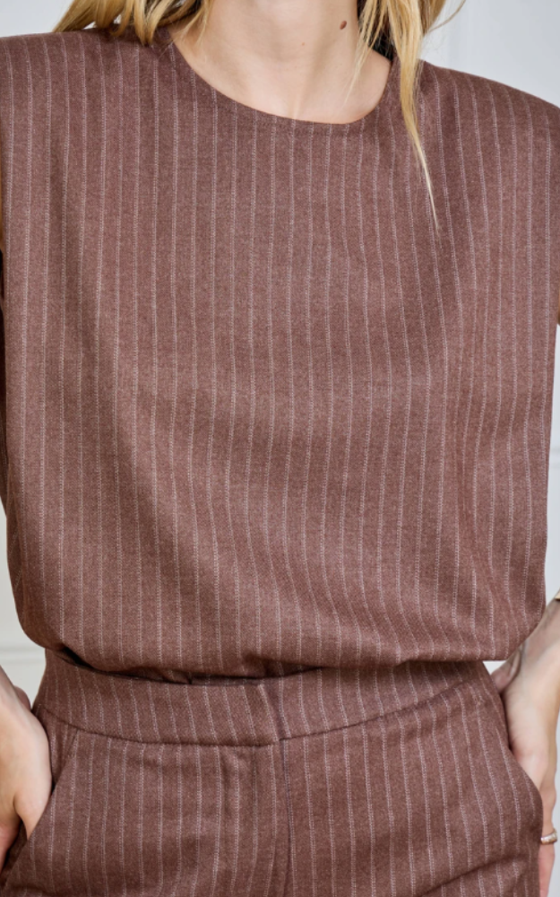 Top strutturato a righe sottili, dal taglio pulito e moderno. Le linee essenziali e le mini spalline creano un effetto scultoreo che dona carattere al look, mantenendo al tempo stesso un’eleganza minimal. Perfetto in coordinato con i pantaloni, la giacca o la gonna Thomas, ma anche come pezzo singolo per outfit versatili e sofisticati.