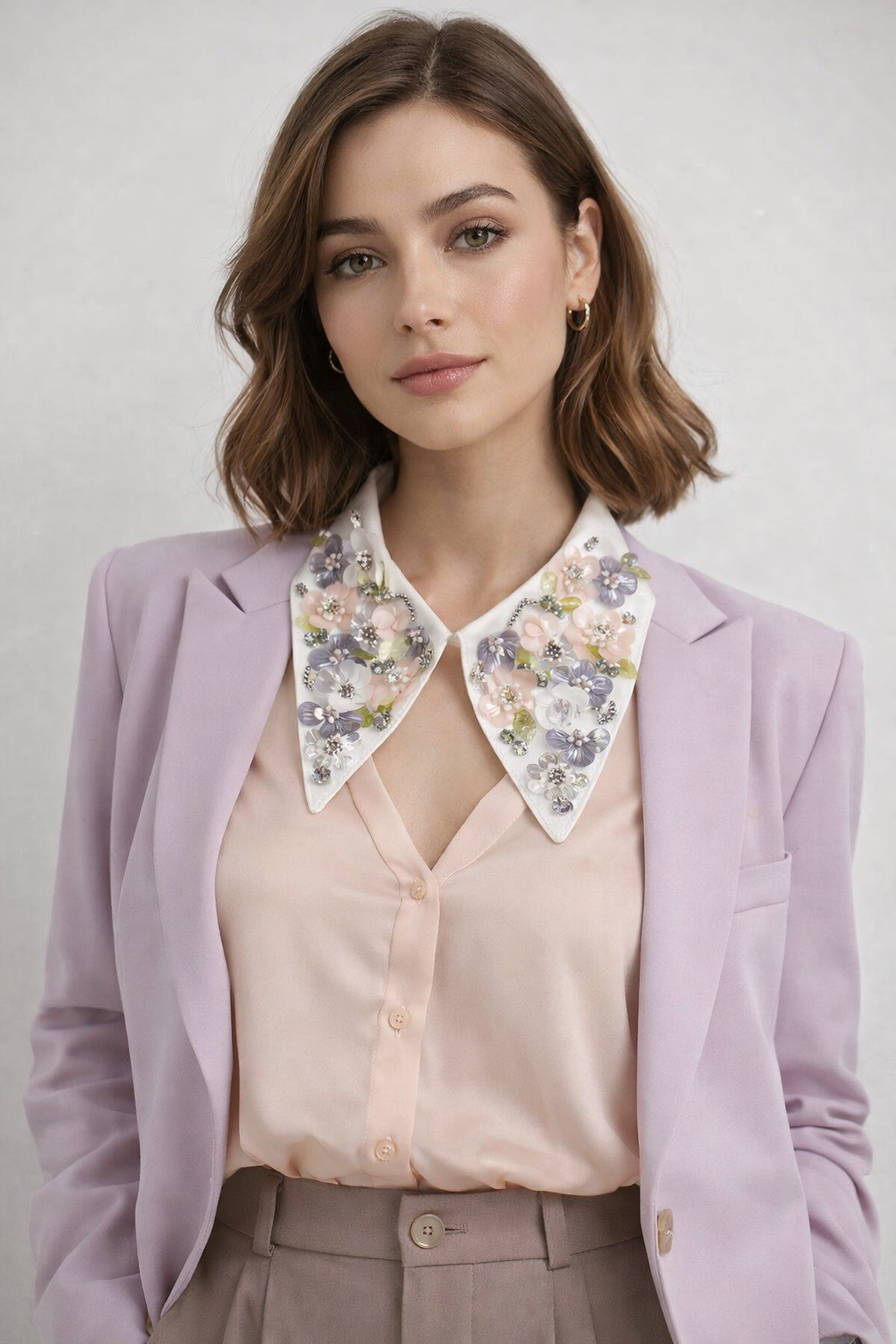 Collar in fabric with stones, coral, sequin flower entirely sewn by hand. The soft but decisive lines bring character and elegance to the outfit.