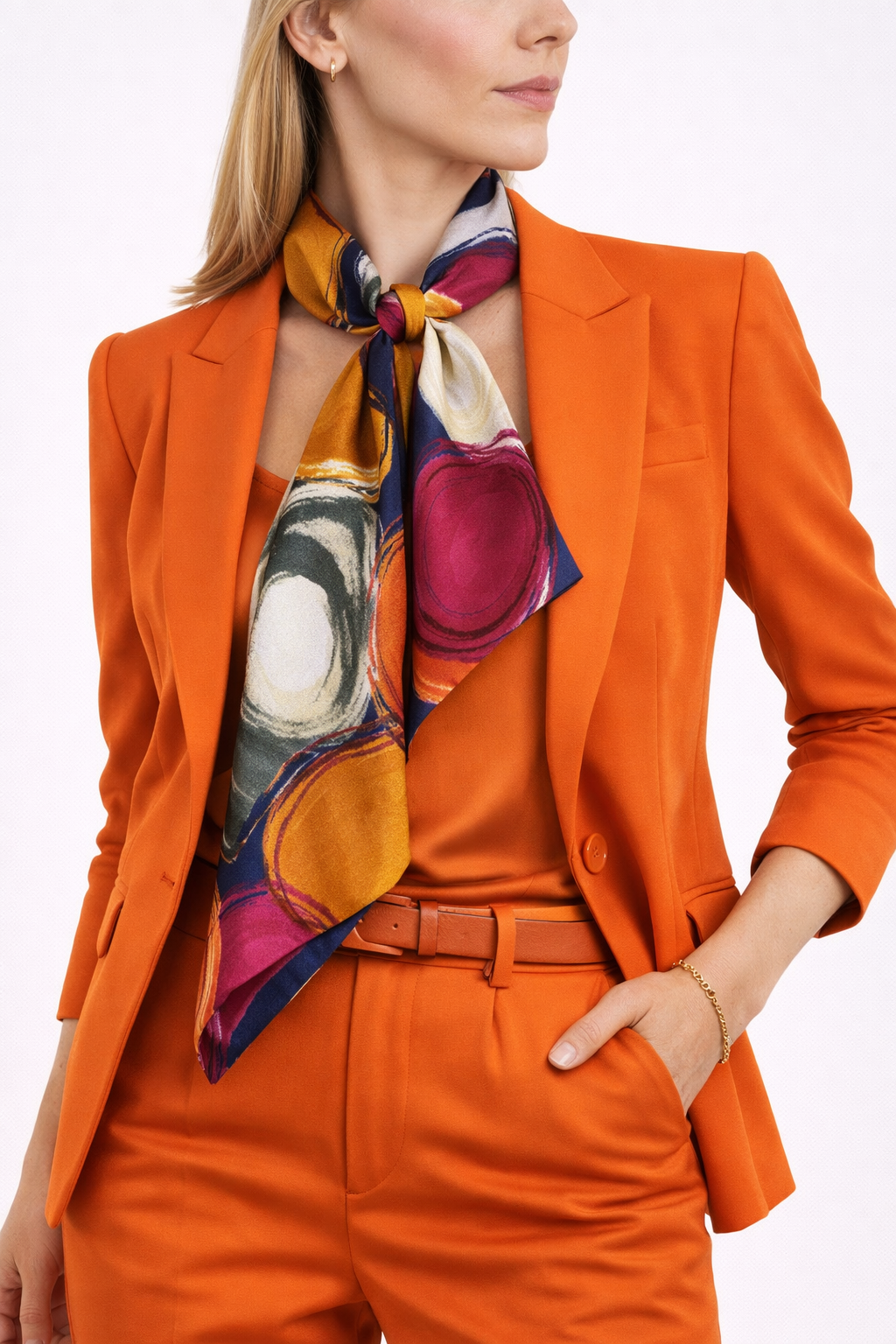 A colorful scarf in a graphic style, ideal for giving the look a sophisticated and elegant note of femininity. A creation wearable as a scarf when folded and tied around the neck, as a belt enriching a dress or pants for a captivating style or as a hat / headband to make the hairstyle sparkling.