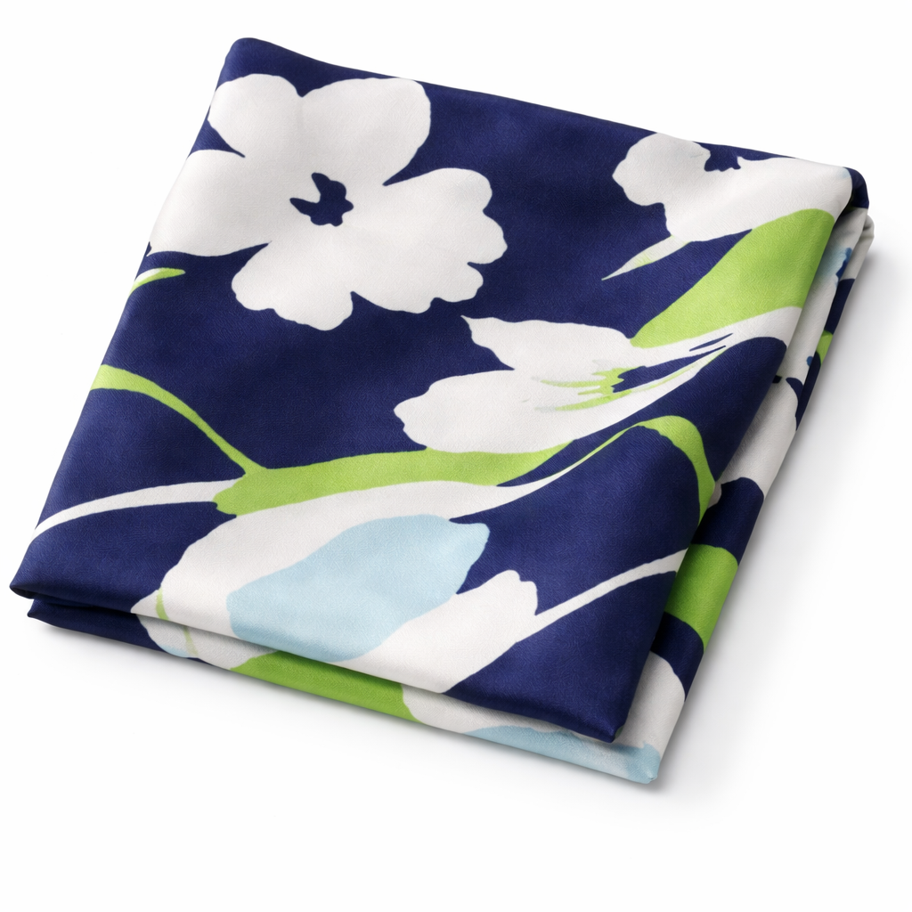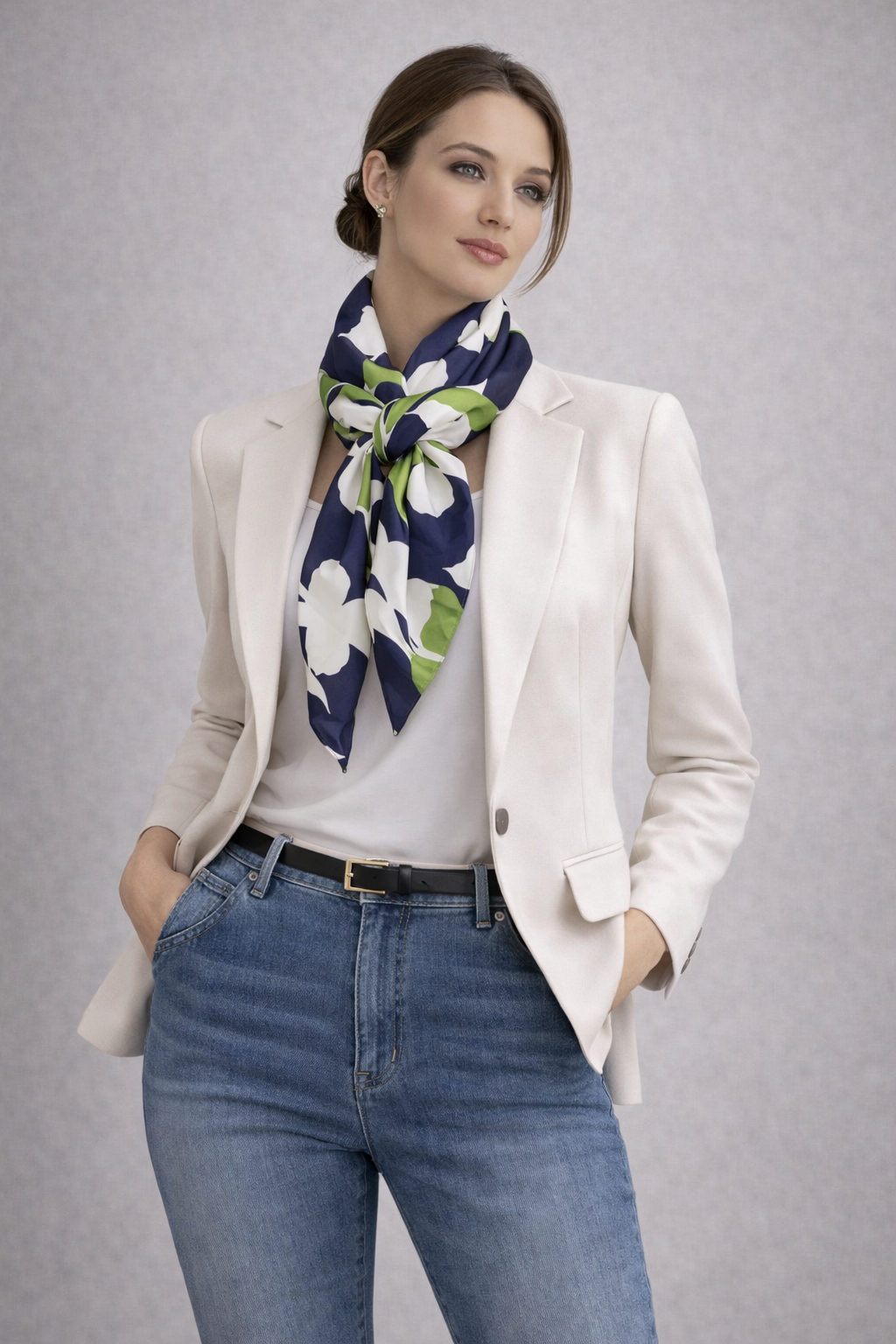 A foulard with soft lines and colors that evoke the sea and the sky: the charm that resists time.