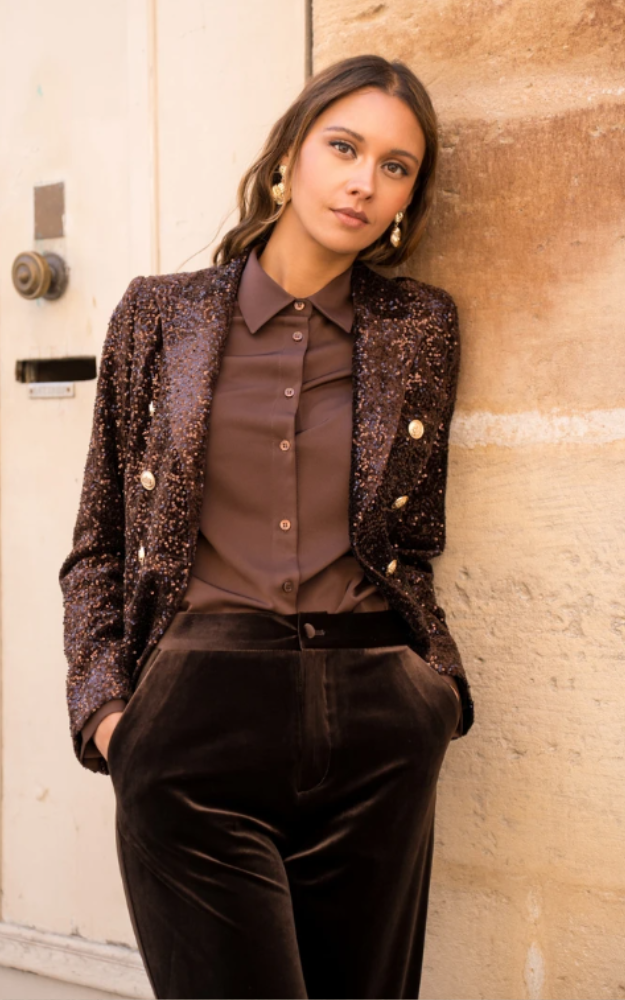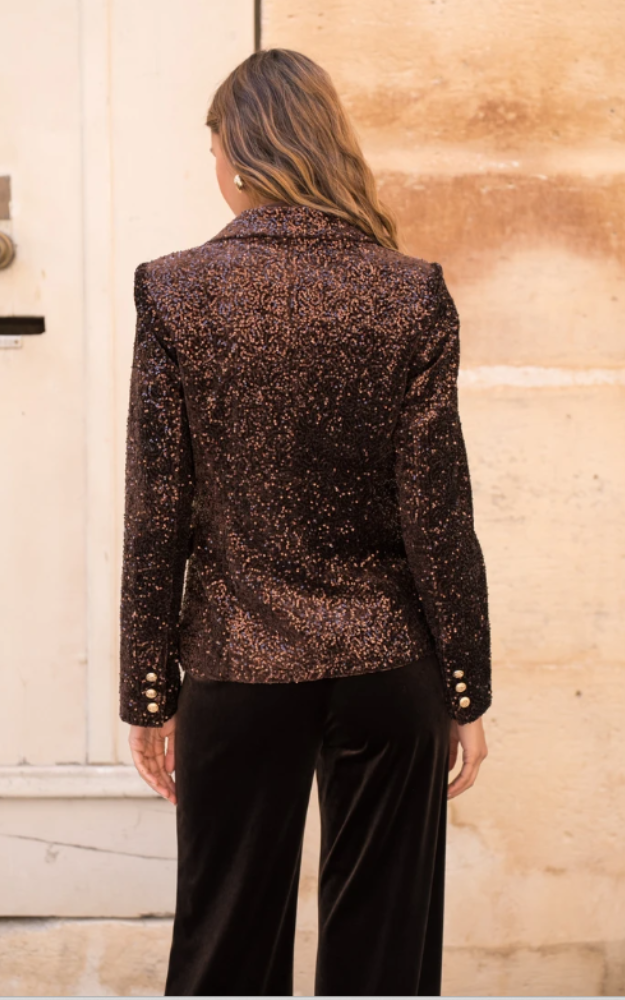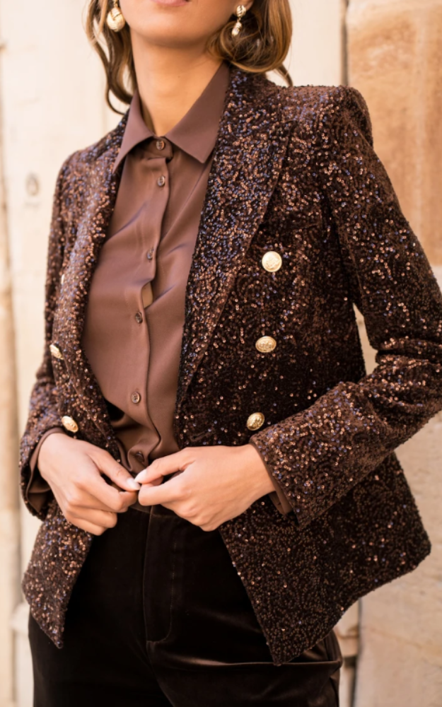 La giacca Elisabeth è un capo dall’anima audace e sofisticata, interamente ricoperta di paillettes che riflettono la luce con raffinatezza. Il taglio aderente a doppiopetto con bottoni dorati testurizzati slancia la figura, mentre il colletto a revers classico e le spalle leggermente strutturate donano carattere e presenza. Realizzata in un tessuto luminoso e pregiato, è perfetta per rendere speciale ogni occasione, dal cocktail party agli eventi serali più esclusivi.