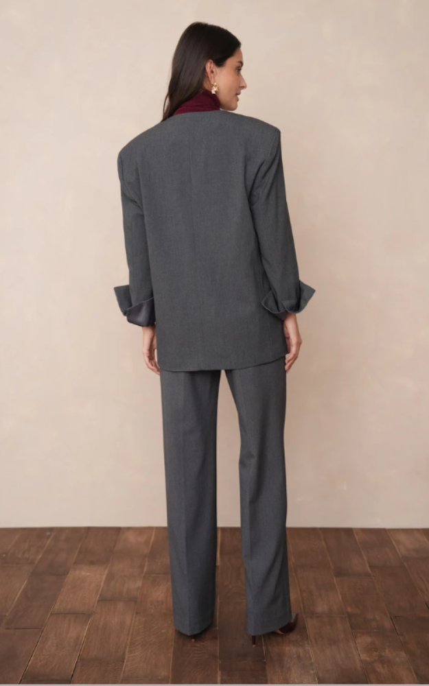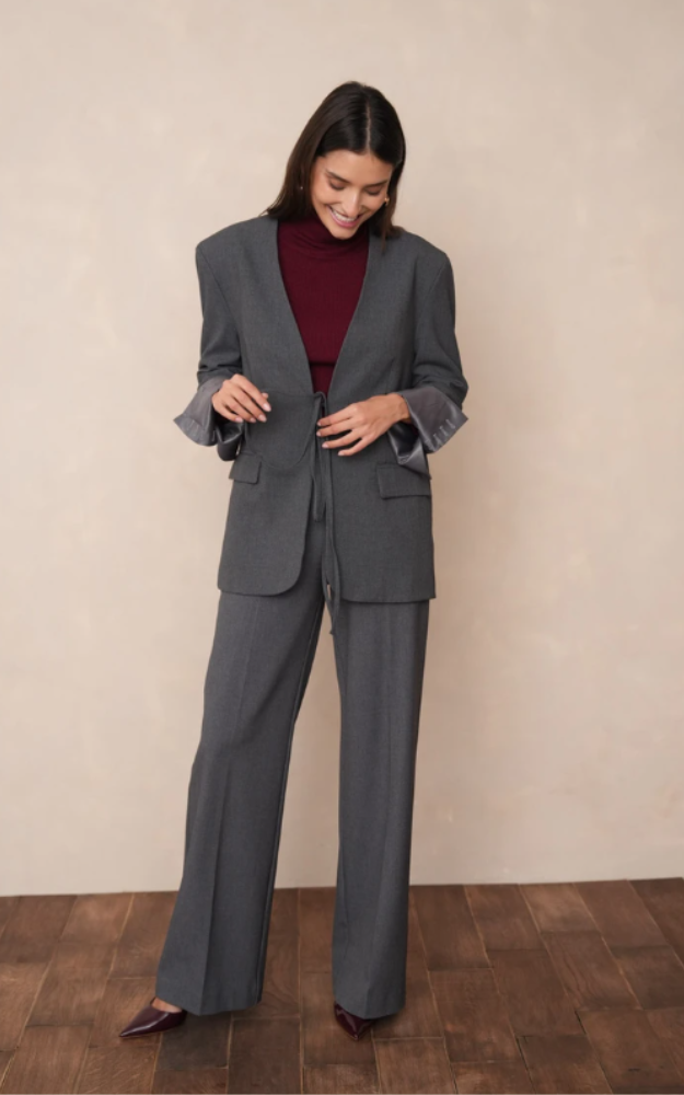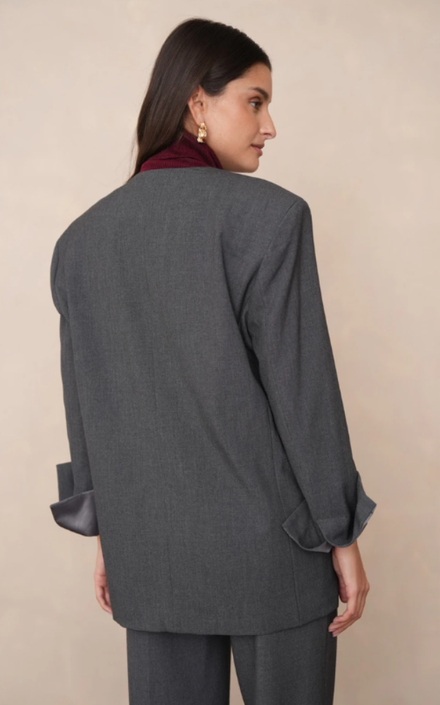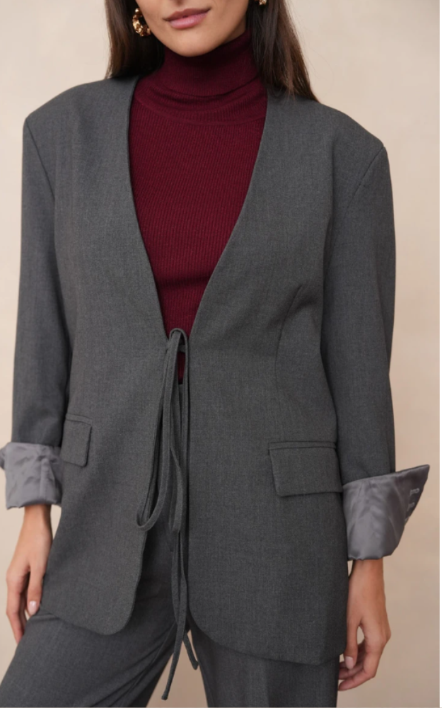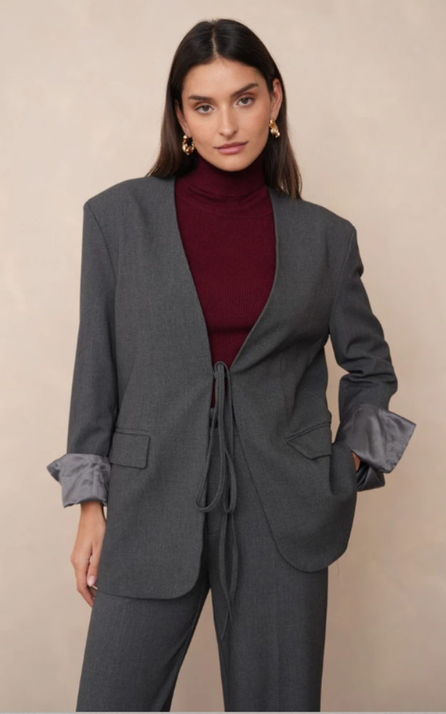 Giacca oversize tinta unita dal design essenziale e raffinato, caratterizzata da un taglio dritto e leggermente ampio che dona un’eleganza disinvolta. Lo scollo a V senza colletto valorizza la linea pulita del capo, mentre la chiusura con cintura annodata sul davanti definisce la silhouette con naturalezza, senza l’uso di bottoni visibili. Le maniche lunghe con risvolto e le tasche laterali con patta completano il modello con dettagli sartoriali moderni e funzionali.