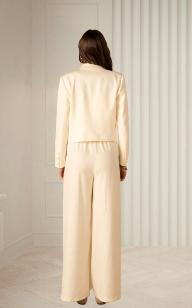 Giacca corta dal design raffinato e contemporaneo, caratterizzata da un elegante taglio incrociato che valorizza la silhouette con equilibrio. Le tasche a filetto mantengono una linea pulita ed essenziale, mentre i bottoni coperti sul davanti e sui polsini aggiungono un dettaglio sartoriale discreto e sofisticato. Un capo versatile, ideale per completare look eleganti e moderni, sia da giorno che da sera.