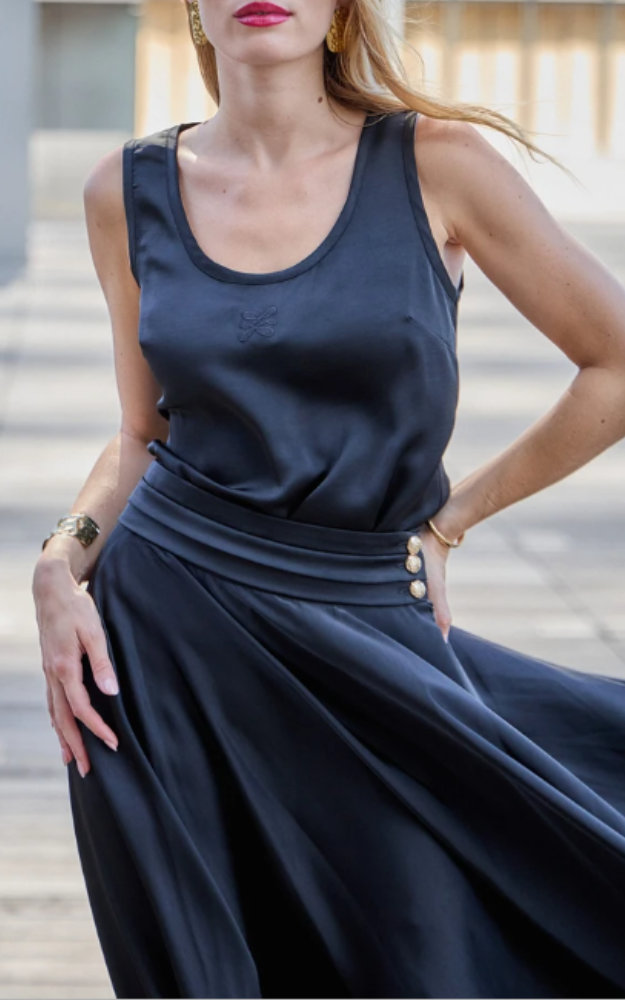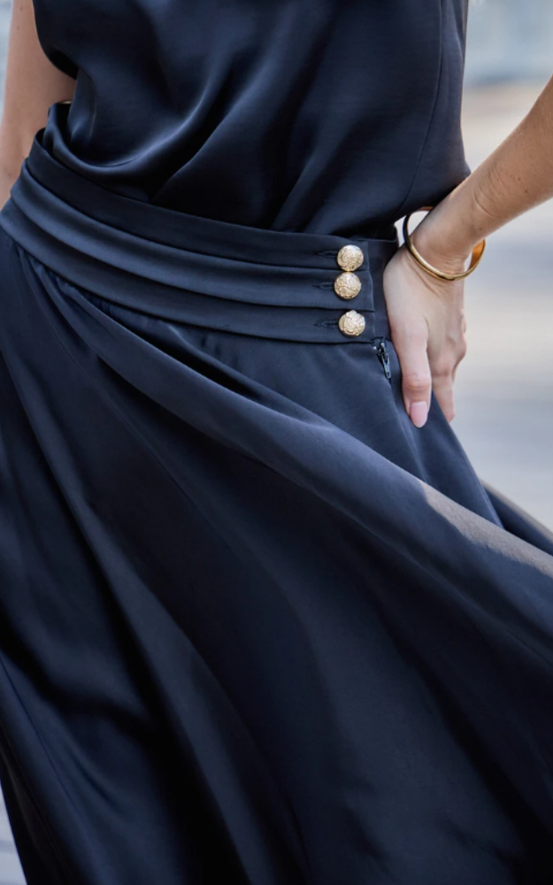 La gonna Amy lunga in satin si distingue per il suo taglio a trapezio fluido, che valorizza la silhouette con eleganza e movimento. La cerniera laterale la rende pratica da indossare, mentre i bottoni dorati in vita aggiungono un dettaglio raffinato e luminoso.