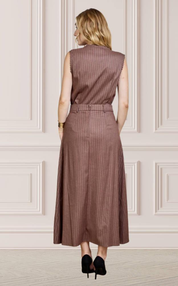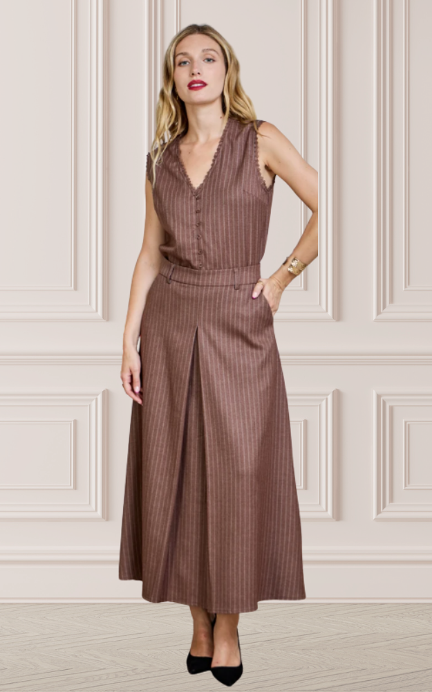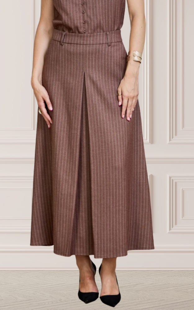 Una gonna dalla linea fluida e sartoriale, realizzata in tessuto morbido effetto  flanella a righe per un’eleganza senza tempo. La lunghezza midi e il taglio ampio valorizzano la silhouette con naturalezza, mentre le tasche laterali anteriori e i passanti per cintura aggiungono praticità e stile. Un capo versatile pensato per essere abbinato alla giacca Thomas e al top coordinato, oppure indossato singolarmente per un look sofisticato.