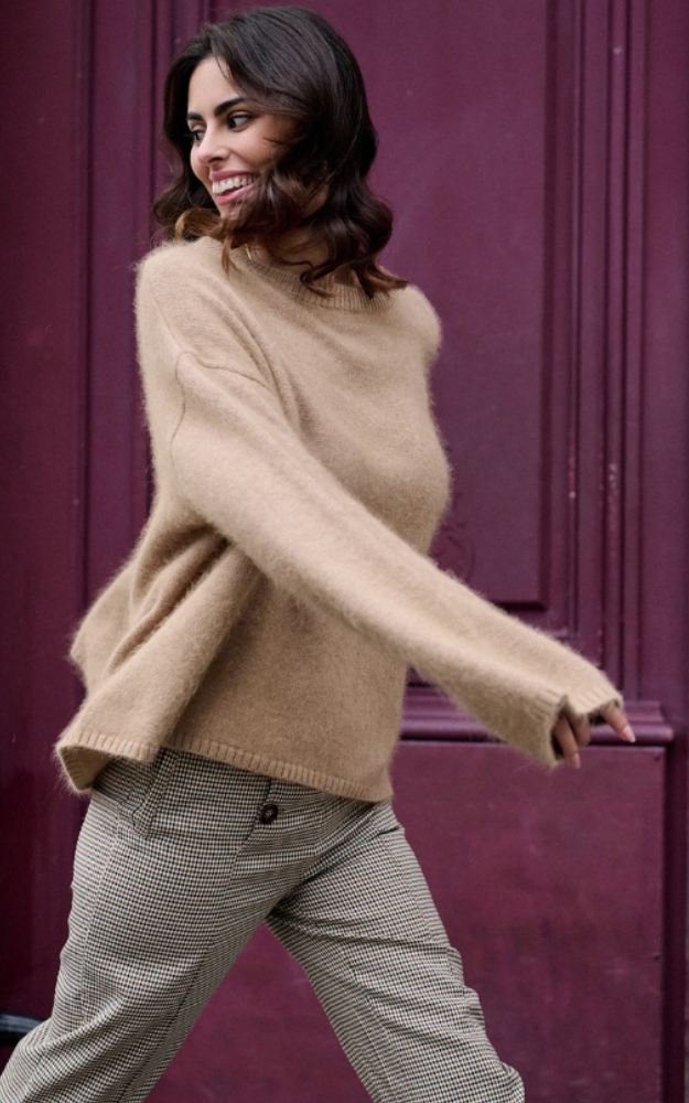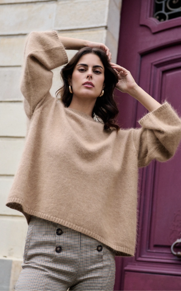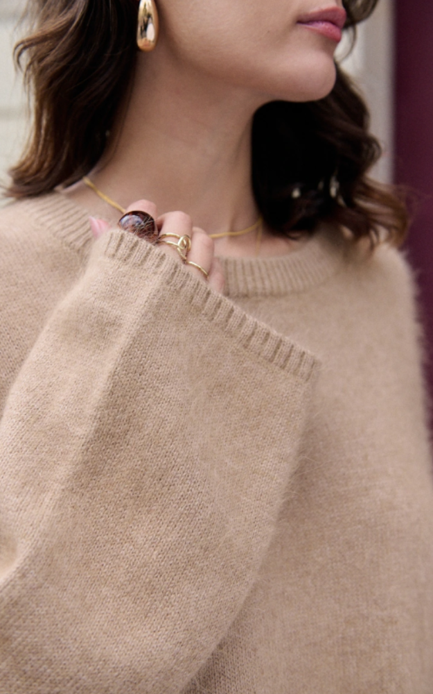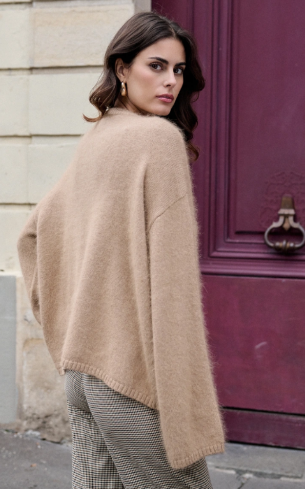Maglione in misto angora dal tocco morbido e avvolgente. Caratterizzato da una vestibilità oversize e maniche lunghe, presenta uno scollo rotondo e finiture a coste per un effetto naturale e raffinato. Un capo essenziale, perfetto per creare look caldi e sofisticati.