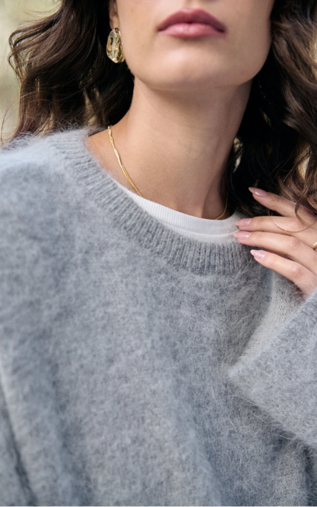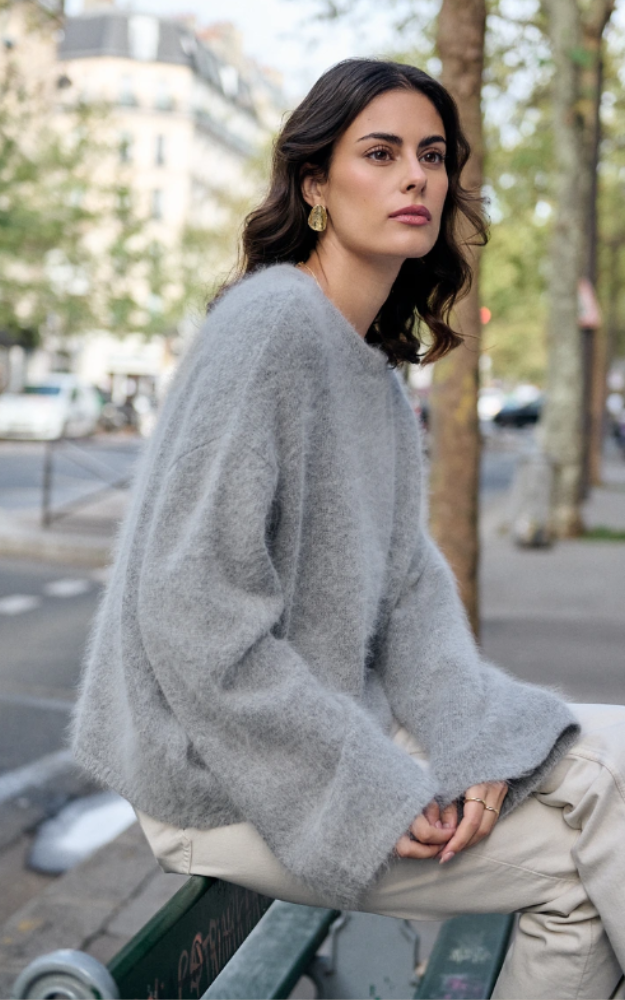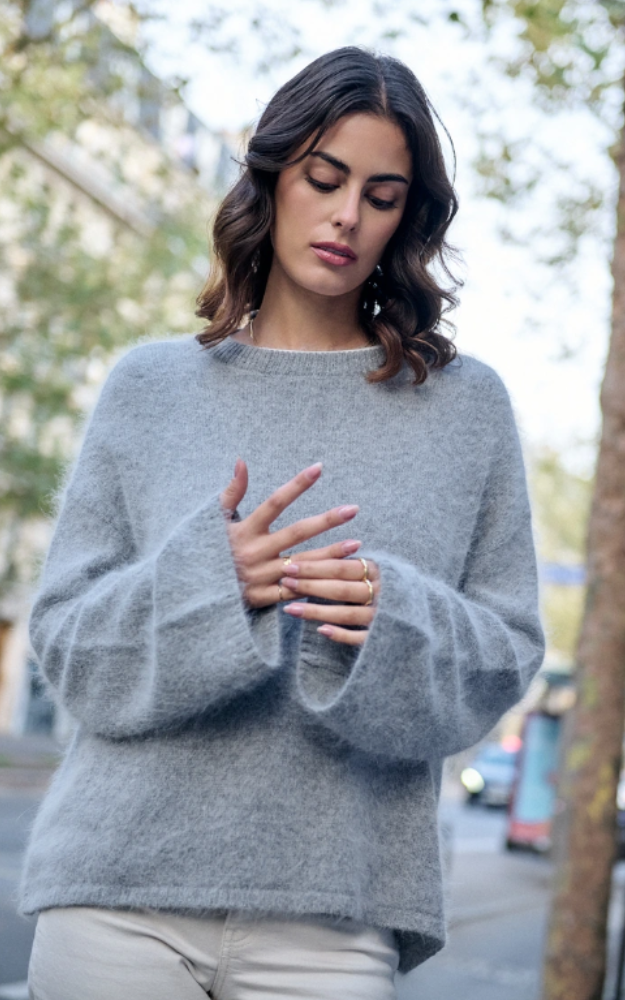 Maglione in misto angora dal tocco morbido e avvolgente. Caratterizzato da una vestibilità oversize e maniche lunghe, presenta uno scollo rotondo e finiture a coste per un effetto naturale e raffinato. Un capo essenziale, perfetto per creare look caldi e sofisticati.