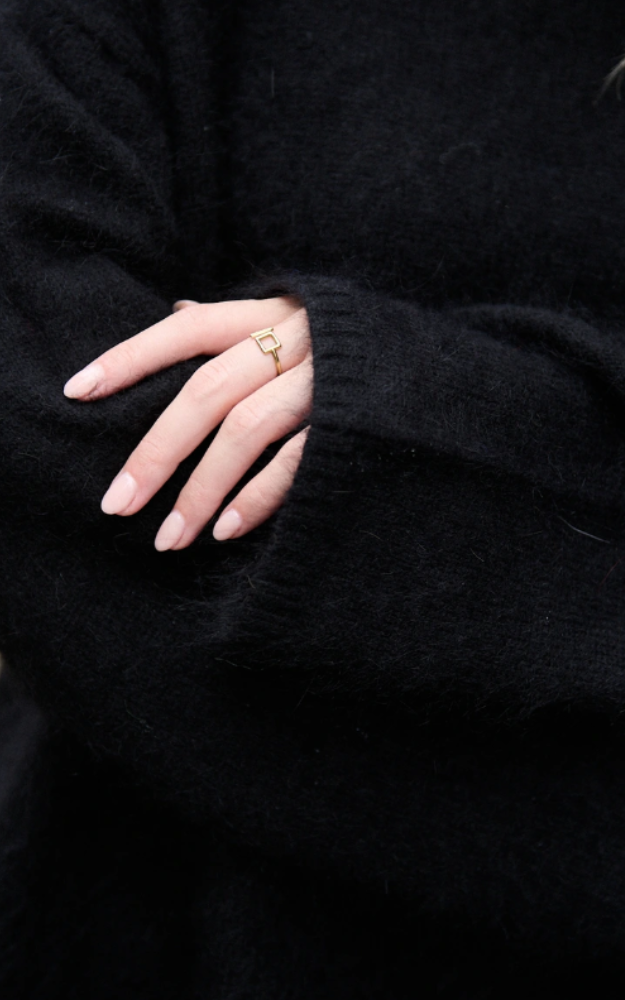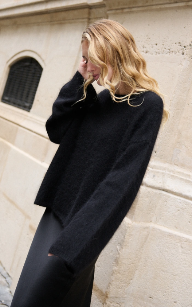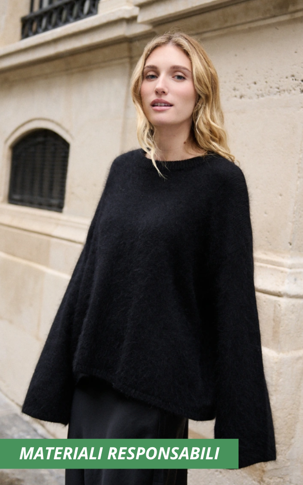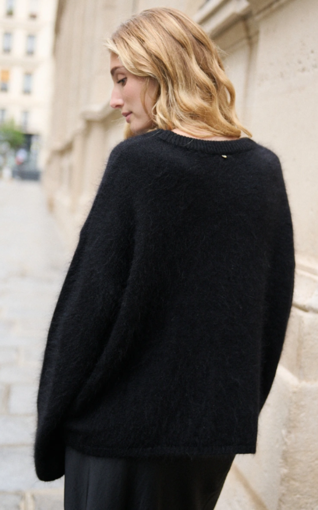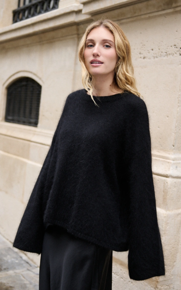 Maglione in misto angora dal tocco morbido e avvolgente. Caratterizzato da una vestibilità oversize e maniche lunghe, presenta uno scollo rotondo e finiture a coste per un effetto naturale e raffinato. Un capo essenziale, perfetto per creare look caldi e sofisticati.