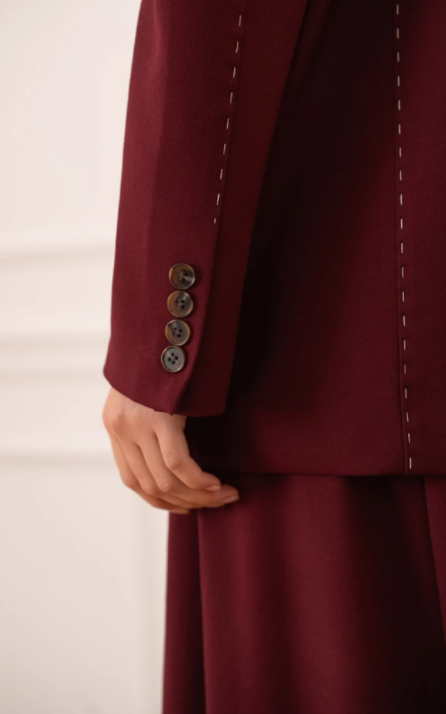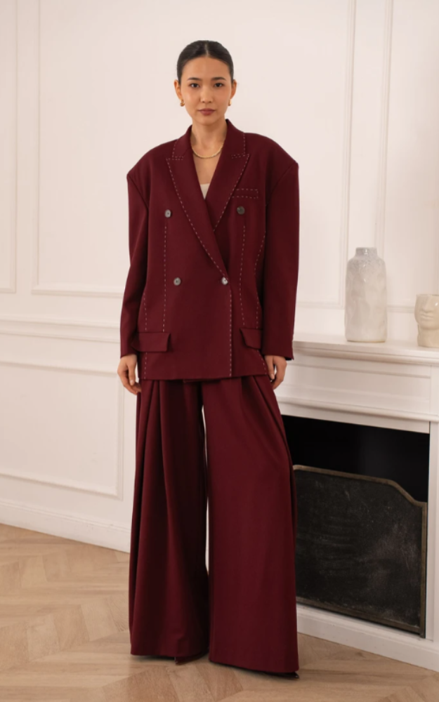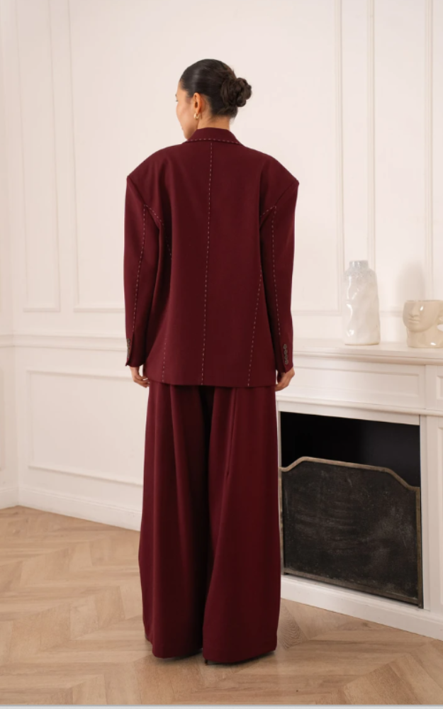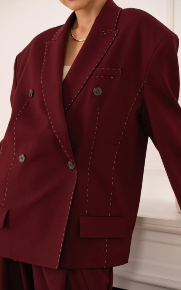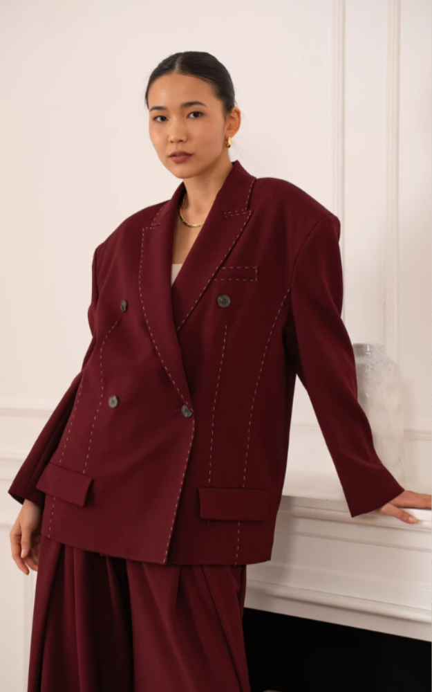 Giacca oversize doppiopetto realizzata in un tessuto strutturato, impreziosita da impunture bianche a contrasto che ne definiscono le linee con eleganza. Gli ampi revers e le tasche con patta, insieme al taschino profilato sul petto, donano un tocco sartoriale e contemporaneo. Un capo dal carattere deciso, ideale per creare look moderni e raffinati.