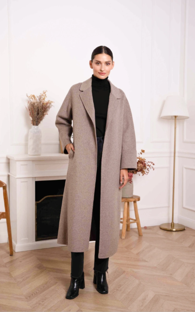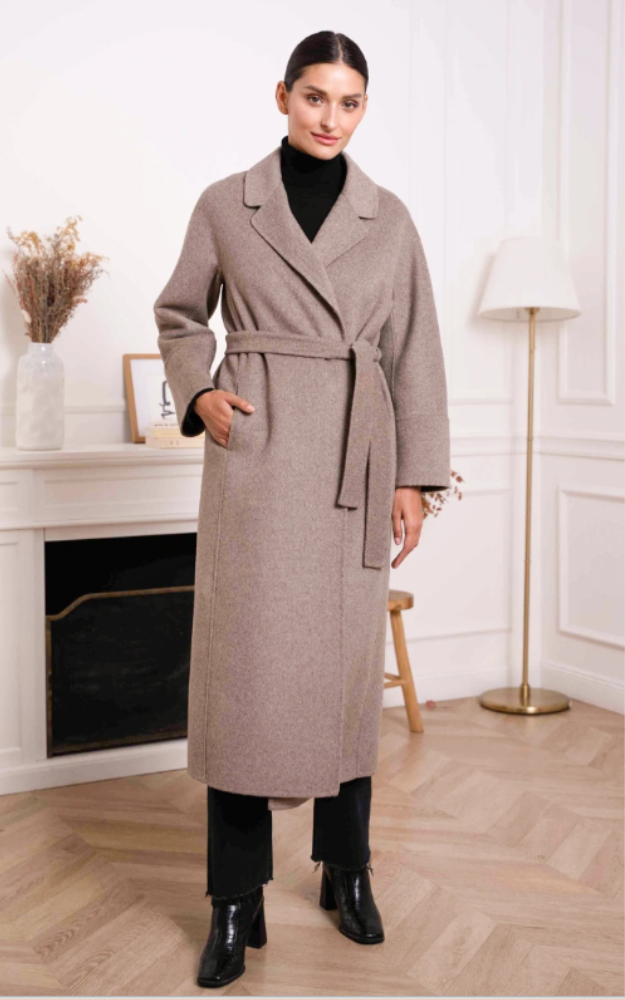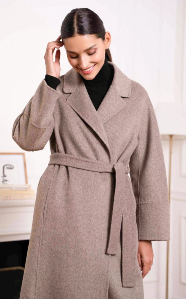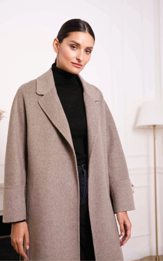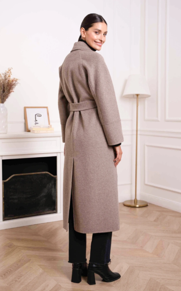 Cappotto a vestaglia in misto lana cucito a mano, dal taglio avvolgente e raffinato. Presenta cintura coordinata da annodare in vita e uno spacco posteriore che ne esalta il movimento. Un modello elegante e senza tempo, perfetto per completare look sofisticati e quotidiani.